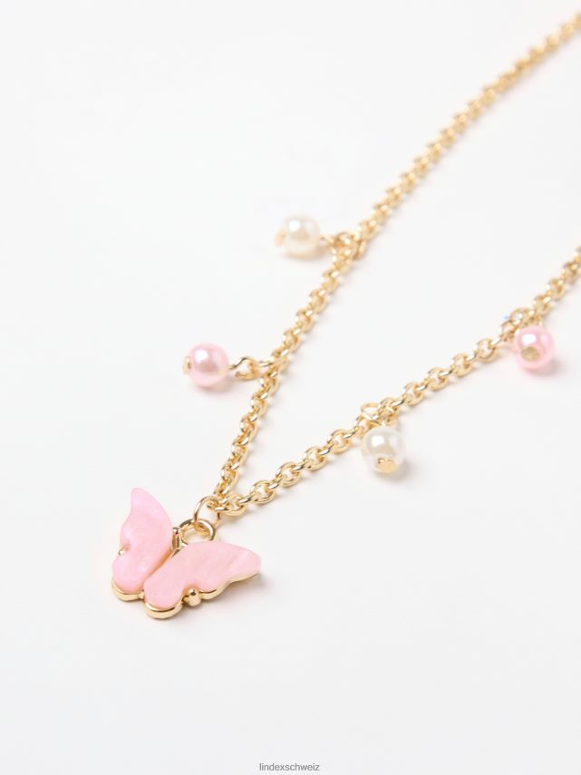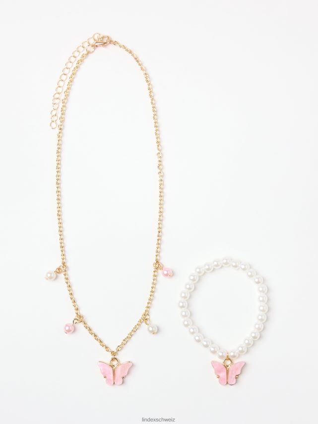un joli ensemble comprenant un collier avec une chaîne dorée et un bracelet élastique en perles. tous deux avec des breloques papillon roses.