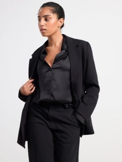 blazer tissé à manches longues, fermeture à double boutonnage et fines épaulettes.