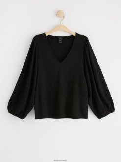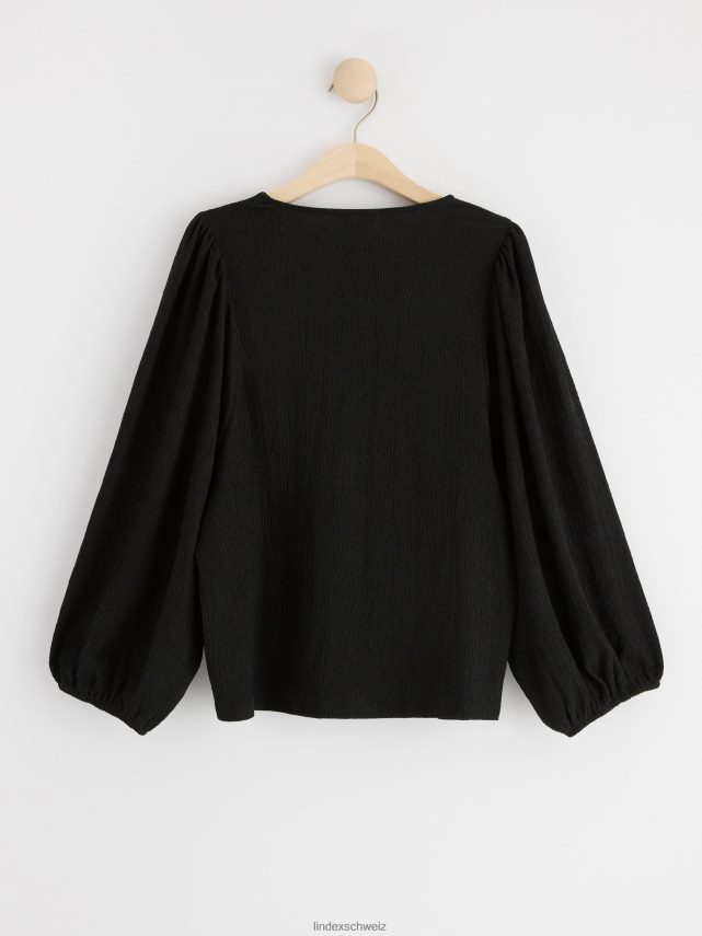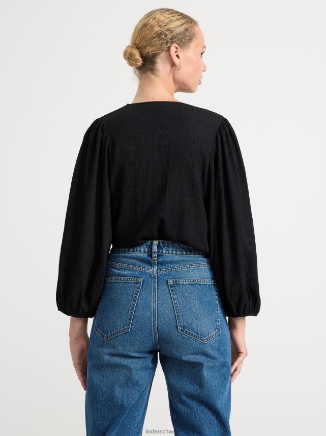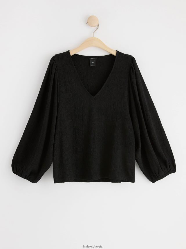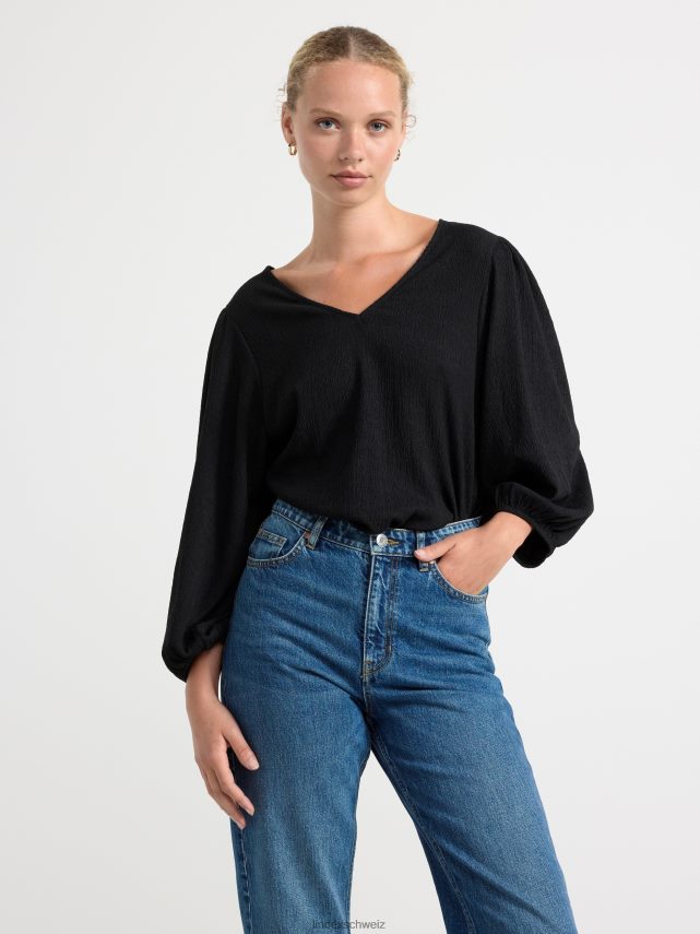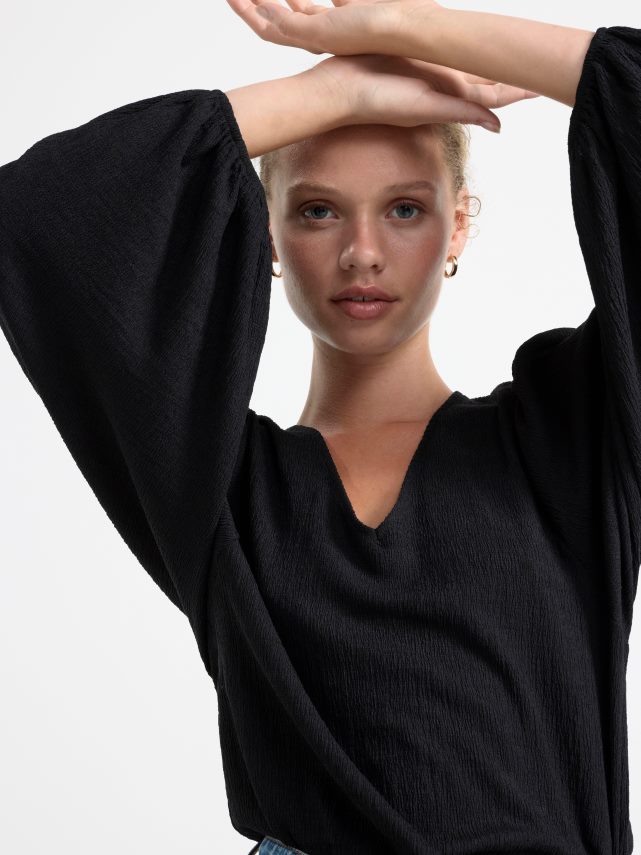 un chemisier fluide avec des manches bouffantes et un col en V, confectionné dans une matière légère et texturée. matériel. cette pièce est partiellement fabriquée en polyester recyclé. Lorsque l’on utilise du polyester recyclé, cela signifie que des matériaux qui ont déjà été produits, comme les bouteilles en PET, ont une autre chance. il est beaucoup plus économe en ressources que la production de nouveaux matériaux, ce qui le rend meilleur pour l’environnement et réduit l’impact climatique.