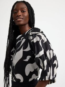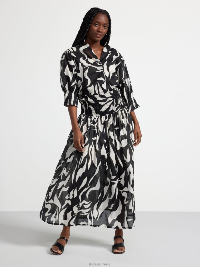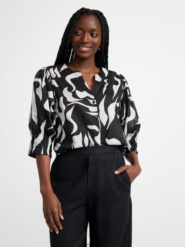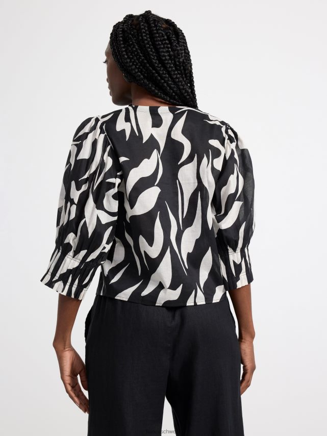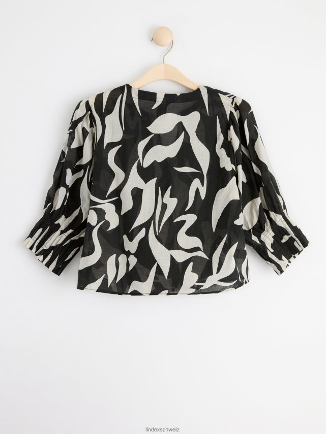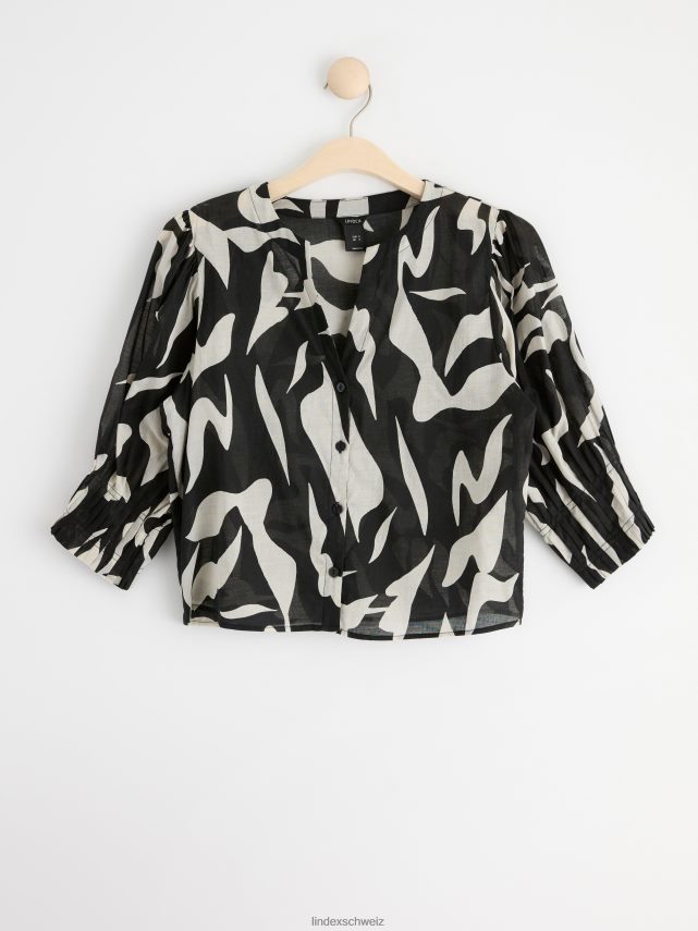 un chemisier à motifs avec des manches trois-quarts bouffantes et des boutons sur le devant. fabriqué en tissu de coton léger.