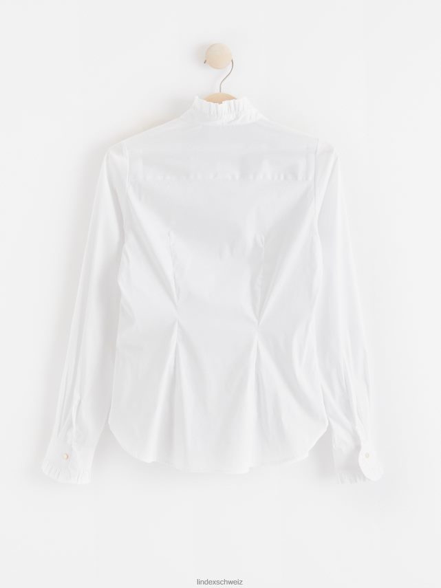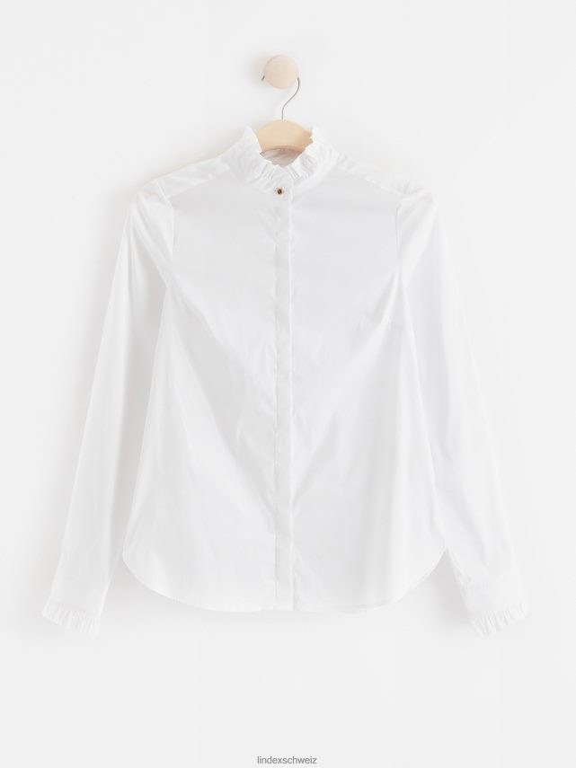 un chemisier élégant avec des manches longues et des détails volants sur le cou et les manches, fabriqué en mélange de coton doux.