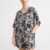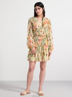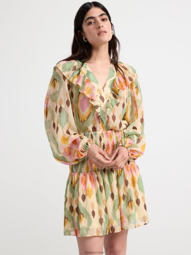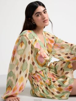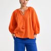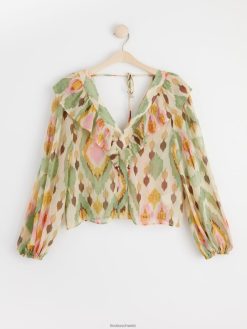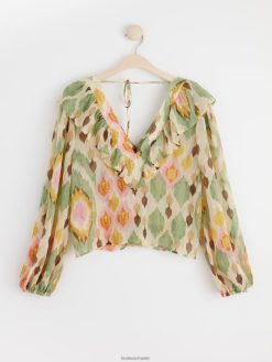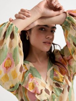 un chemisier léger en mousseline à manches longues, col en V sur le devant et dans le dos et volants sur l’encolure.
