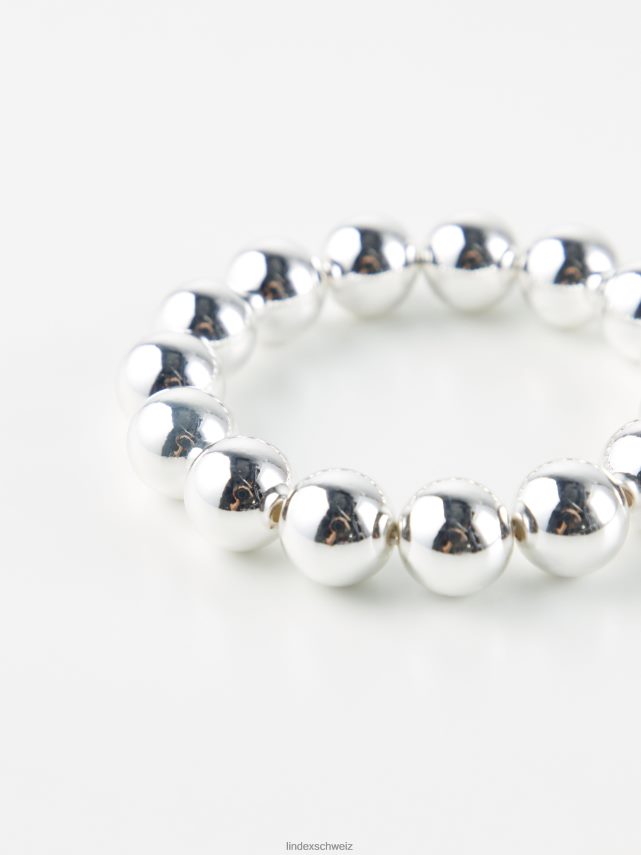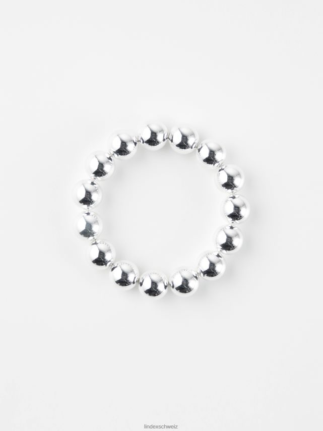 un bracelet élastique avec des perles en plastique de couleur argentée.
