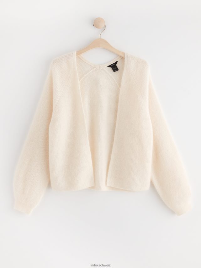 Cardigan tricoté doux en laine mélangée avec manches longues, coupe droite et ouvert sur le devant.