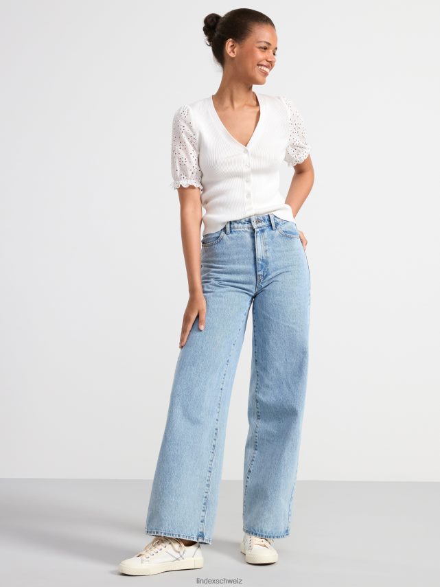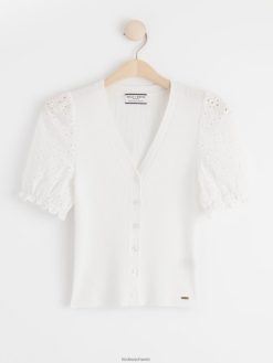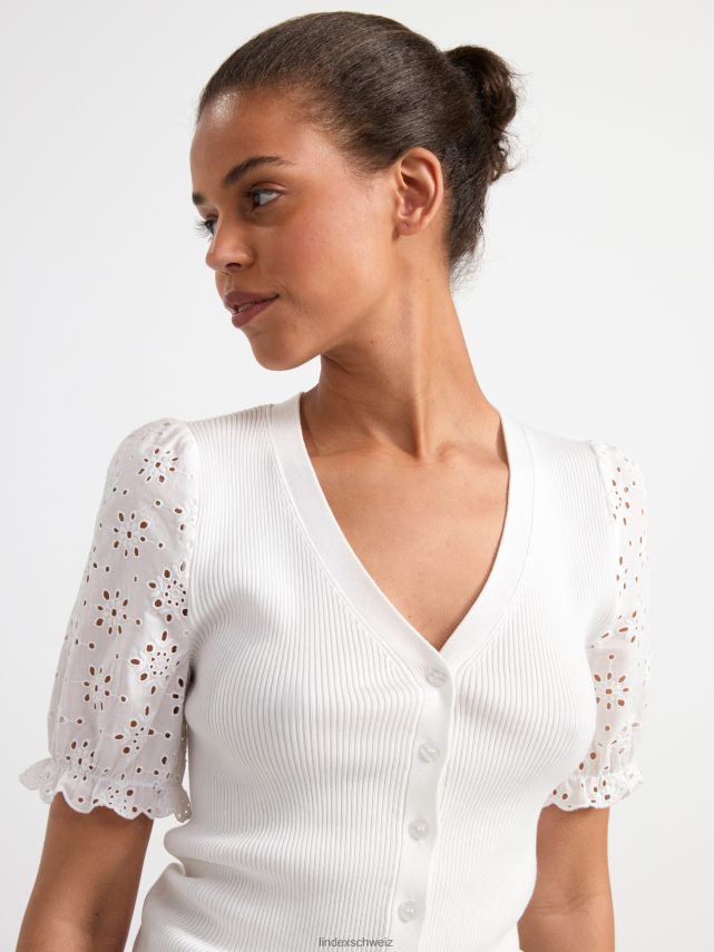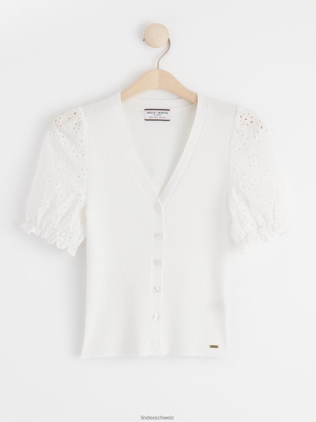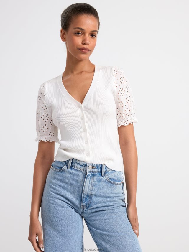 cardigan ajusté en lyocell certifié avec boutons sur le devant, col en V et manches courtes en broderie anglaise, confectionné en mélange de lyocell côtelé. matériel. cette pièce est partiellement réalisée en tencel lyocell. le matériau provient d’une foresterie responsable et est produit avec un impact moindre sur l’environnement. la production s’effectue dans un système en boucle fermée où les produits chimiques sont réutilisés.