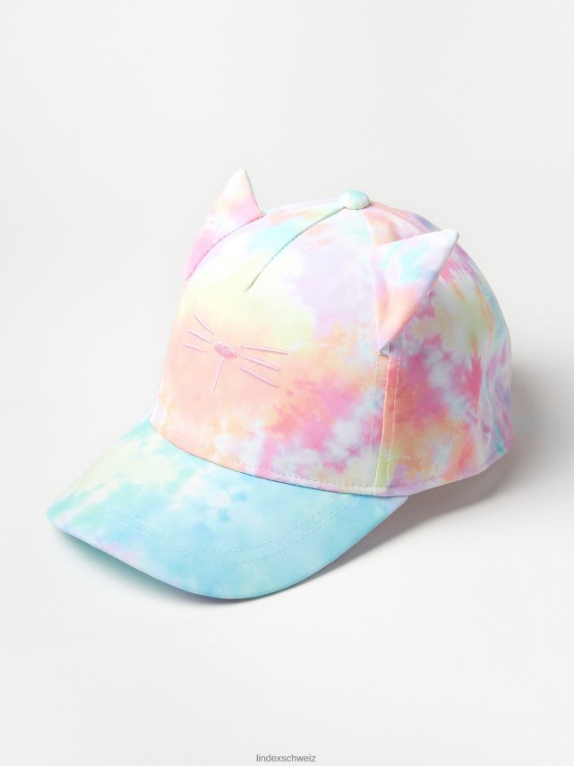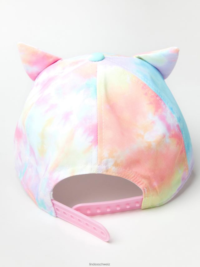 une casquette à visière ronde colorée avec des oreilles de chat cousues, une broderie sur le devant et un imprimé tie-dye intégral. matériel. cette pièce est fabriquée à partir de polyester recyclé. Lorsque l’on utilise du polyester recyclé, cela signifie que des matériaux qui ont déjà été produits, comme les bouteilles en PET, ont une autre chance. il est beaucoup plus économe en ressources que la production de nouveaux matériaux, ce qui le rend meilleur pour l’environnement et réduit l’impact climatique.