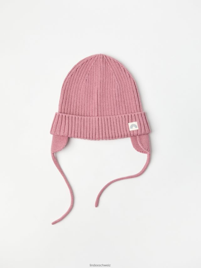 Chapeau doux en tricot côtelé en coton avec bandes à nouer et bord plié.