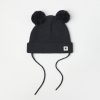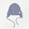 Chapeau doux en tricot côtelé en coton avec bandes à nouer et bord plié.