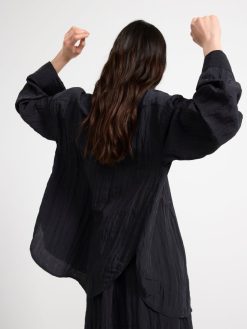 une chemise douce et légère avec une structure froissée sur toute la surface. matériel. cette pièce est partiellement fabriquée en polyester recyclé. Lorsque l’on utilise du polyester recyclé, cela signifie que des matériaux qui ont déjà été produits, comme les bouteilles en PET, ont une autre chance. il est beaucoup plus économe en ressources que la production de nouveaux matériaux, ce qui le rend meilleur pour l’environnement et réduit l’impact climatique.