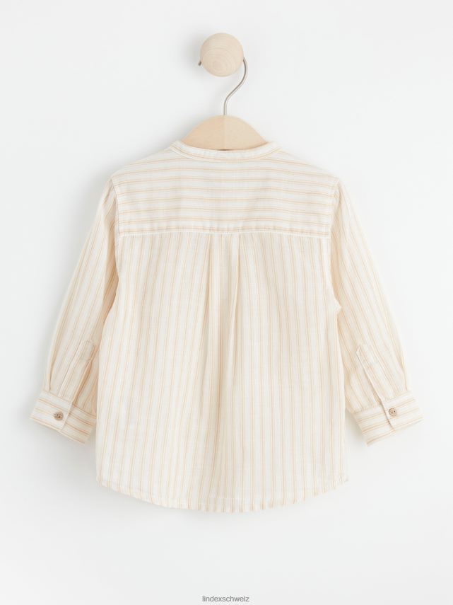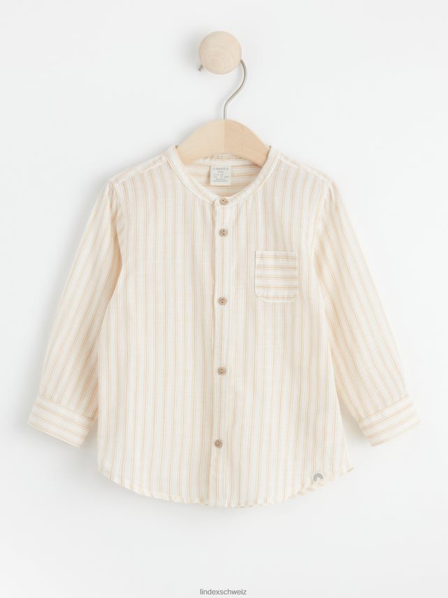 une chemise sans col avec un motif rayé sur toute la surface. matériel. c’est une pièce certifiée Gots. il est fabriqué à partir de coton biologique et chaque étape de la production a été certifiée de manière indépendante pour garantir qu’elle respecte les exigences sociales et environnementales de Gots (norme mondiale des textiles biologiques).