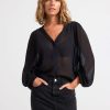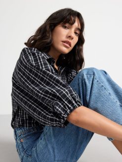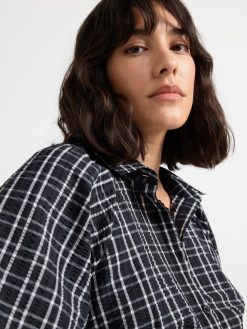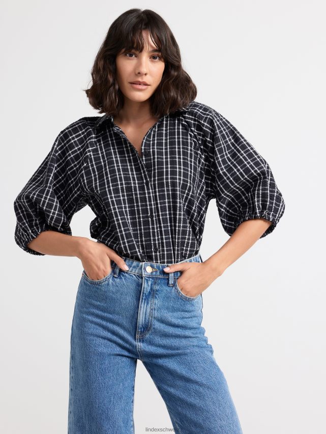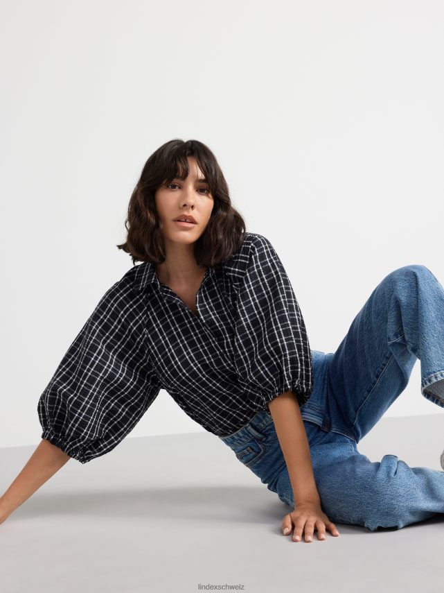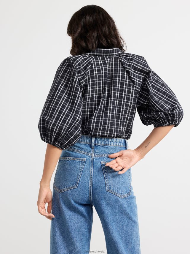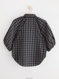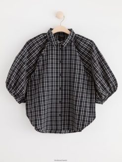 chemisier tissé à carreaux avec manches 3/4, coupe droite et boutons sur le devant.