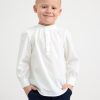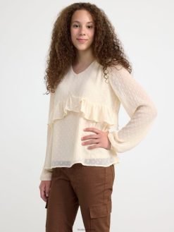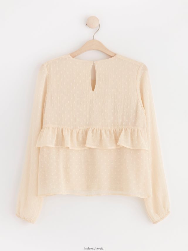 un chemisier romantique avec un motif à pois sur toute la surface et des volants sur le devant et dans le dos. matériel. cette pièce est partiellement fabriquée en polyester recyclé. Lorsque l’on utilise du polyester recyclé, cela signifie que des matériaux qui ont déjà été produits, comme les bouteilles en PET, ont une autre chance. il est beaucoup plus économe en ressources que la production de nouveaux matériaux, ce qui le rend meilleur pour l’environnement et réduit l’impact climatique.