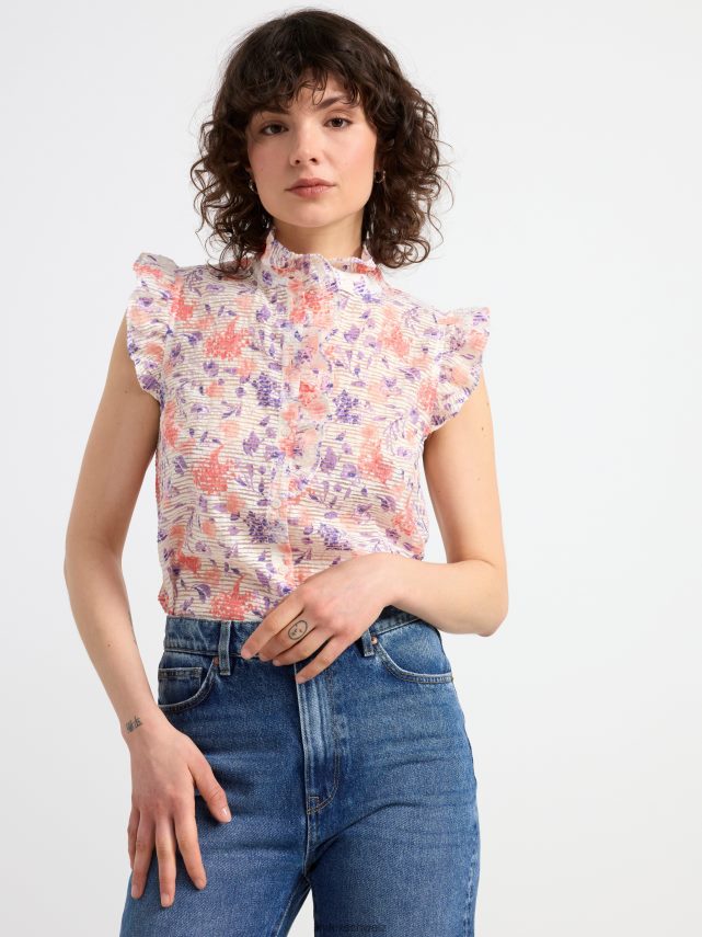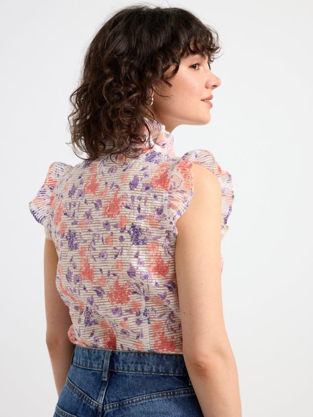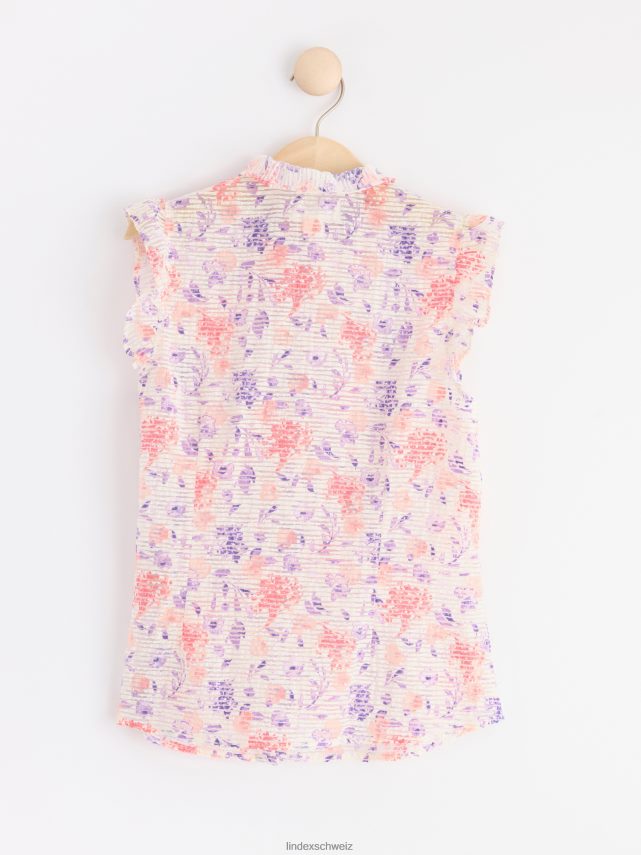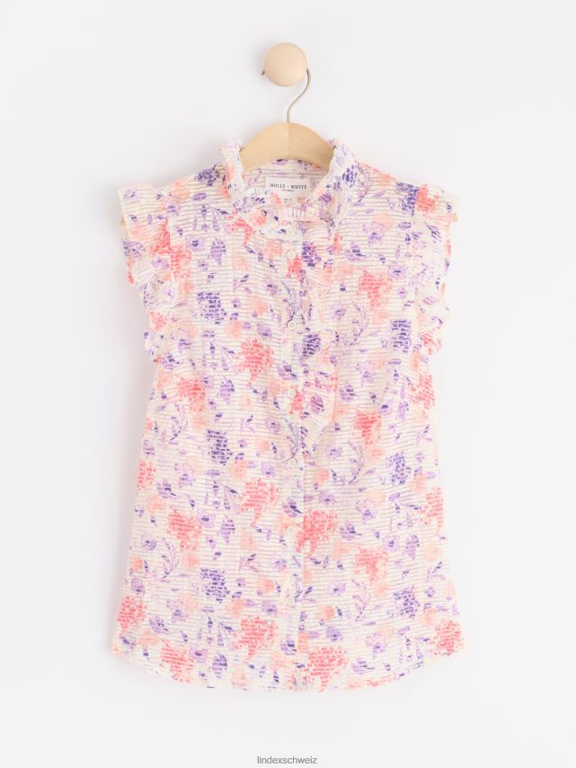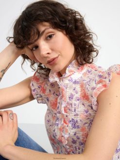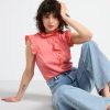 un élégant chemisier sans manches en mélange de coton recyclé avec une texture transparente, des volants à l’ouverture des manches, à l’encolure et sur le devant. matériel. cette pièce est partiellement fabriquée en coton recyclé. en utilisant du coton recyclé, cela signifie que le coton qui a déjà été cultivé et qui aurait été gaspillé a une autre chance. il est beaucoup plus économe en ressources et en eau par rapport à la culture de nouveau coton.