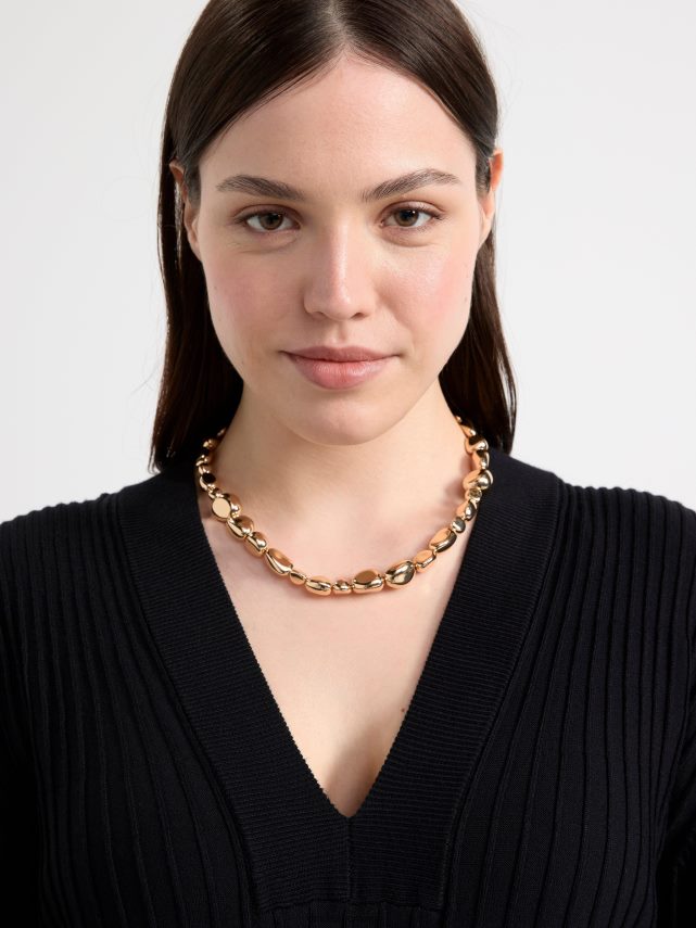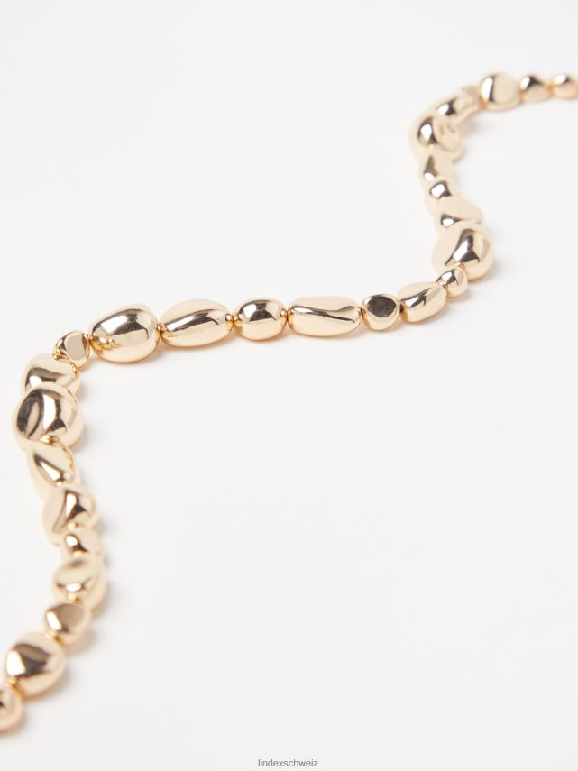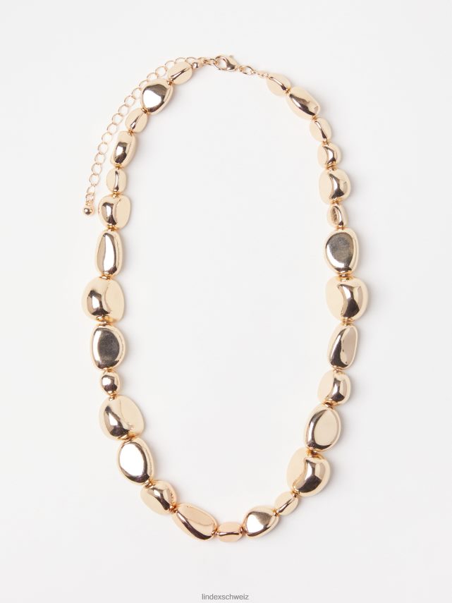 un collier élégant avec des perles en plastique dorées en forme de chapes irrégulières.