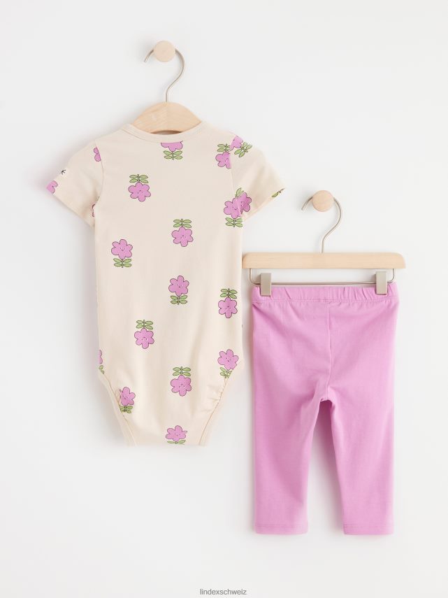 un petit ensemble confortable comprenant un body cache-cœur à manches courtes avec des fleurs lilas et des leggings assortis. le body présente notre solution intelligente de taille étendue avec deux rangées de boutons-poussoirs à l’entrejambe, permettant au bébé de porter le vêtement plus longtemps. matériel. c’est une pièce certifiée Gots. il est fabriqué à partir de coton biologique et chaque étape de la production a été certifiée de manière indépendante pour garantir qu’elle respecte les exigences sociales et environnementales de gots (norme mondiale des textiles biologiques).