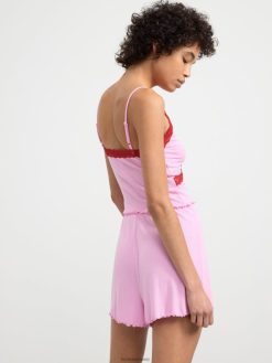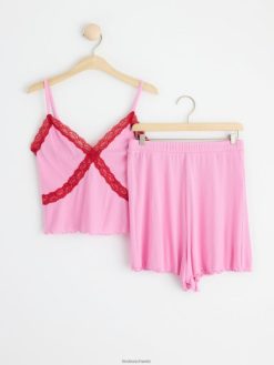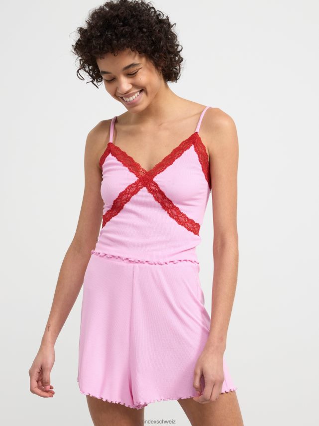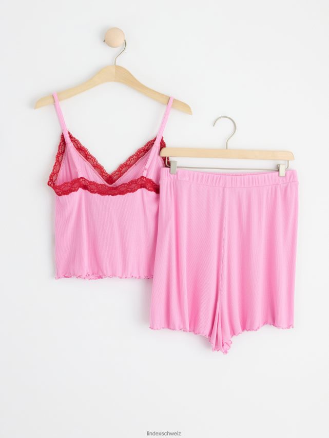 un ensemble côtelé ultra doux comprenant un caraco avec détails en dentelle et un short assorti. matériel. cette pièce est fabriquée en écovero Lenzing, une option plus durable par rapport à la viscose conventionnelle. le matériau provient d’une foresterie responsable et est produit avec un impact moindre sur l’environnement.