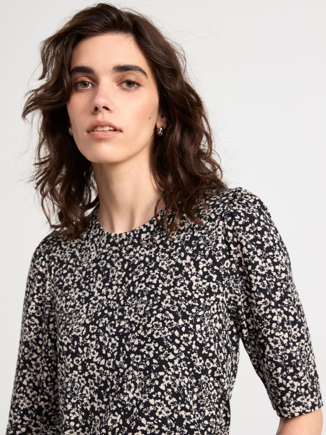 un haut doux et confortable avec des manches courtes bouffantes. matériel. cette pièce est basée une fois de plus sur sodra, une nouvelle matière première innovante en fibre de viscose, où des textiles recyclés sont combinés avec du bois issu de forêts gérées de manière responsable. oncemore est un matériau de haute qualité et est produit avec un impact moindre sur l’environnement par rapport aux matières premières en fibre de viscose conventionnelles.