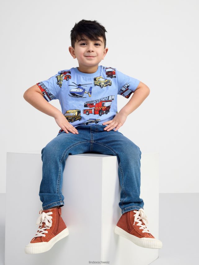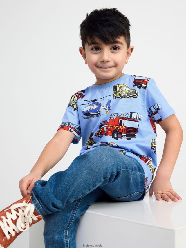 un haut doux à manches courtes avec un imprimé intégral avec des véhicules de secours. matériel. cette pièce est partiellement fabriquée en coton recyclé. en utilisant du coton recyclé, cela signifie que le coton qui a déjà été cultivé et qui aurait été gaspillé a une autre chance. c’est beaucoup plus économe en ressources et en eau par rapport à la culture de nouveau coton.