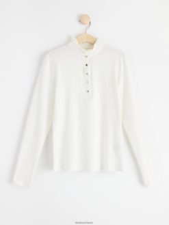 un haut en jersey à manches longues confortable et élégant avec un col à volants et des boutons dorés. matériel. c’est une pièce certifiée Gots. il est fabriqué à partir de coton biologique et chaque étape de la production a été certifiée de manière indépendante pour garantir qu’elle respecte les exigences sociales et environnementales de Gots (norme mondiale des textiles biologiques).