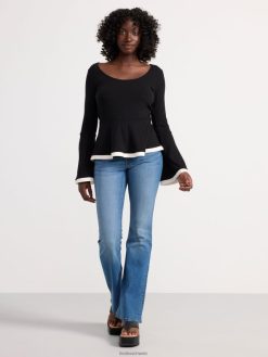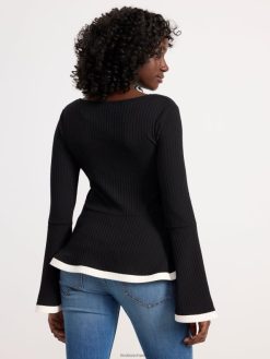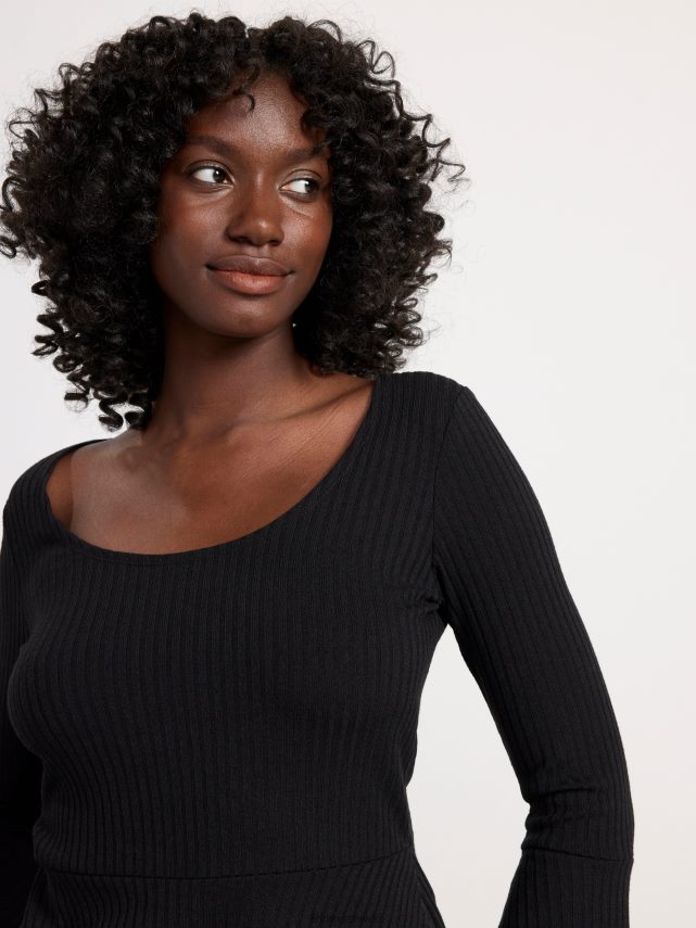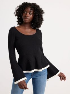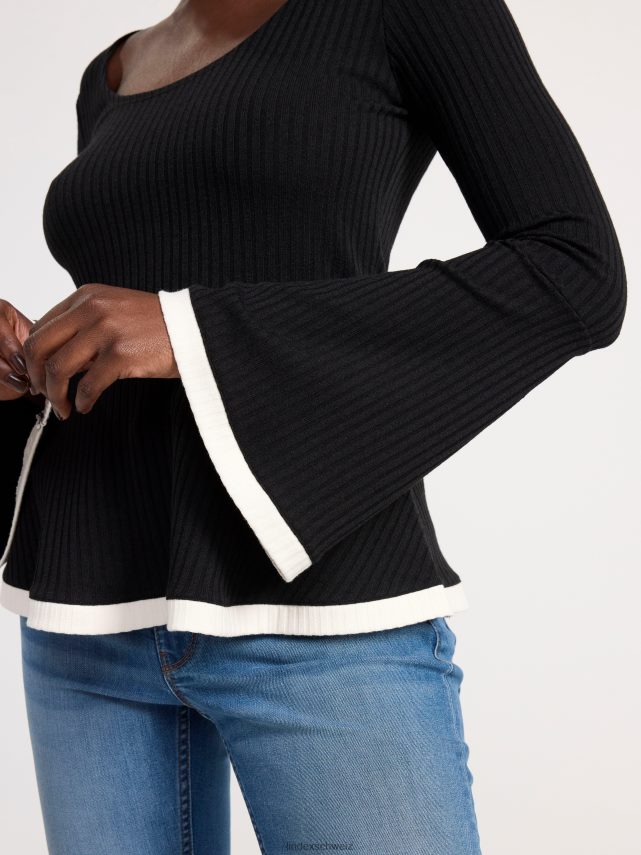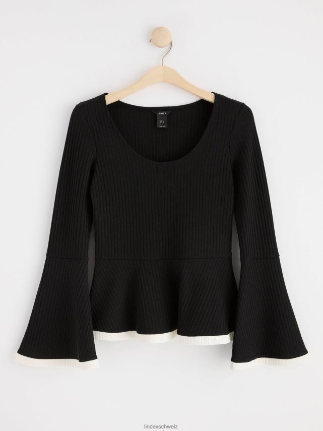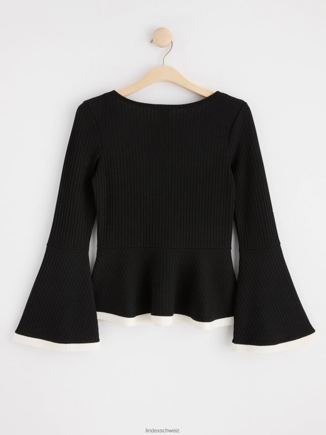 haut élégant à manches longues en tissu côtelé avec une taille à basque et des manches évasées.