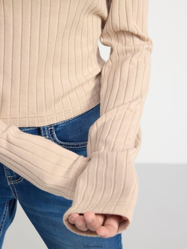 un haut à manches longues doux et côtelé. matériel. cette pièce est fabriquée à partir de polyester recyclé. Lorsque l’on utilise du polyester recyclé, cela signifie que des matériaux qui ont déjà été produits, comme les bouteilles en PET, ont une autre chance. il est beaucoup plus économe en ressources que la production de nouveaux matériaux, ce qui le rend meilleur pour l’environnement et réduit l’impact climatique.