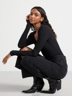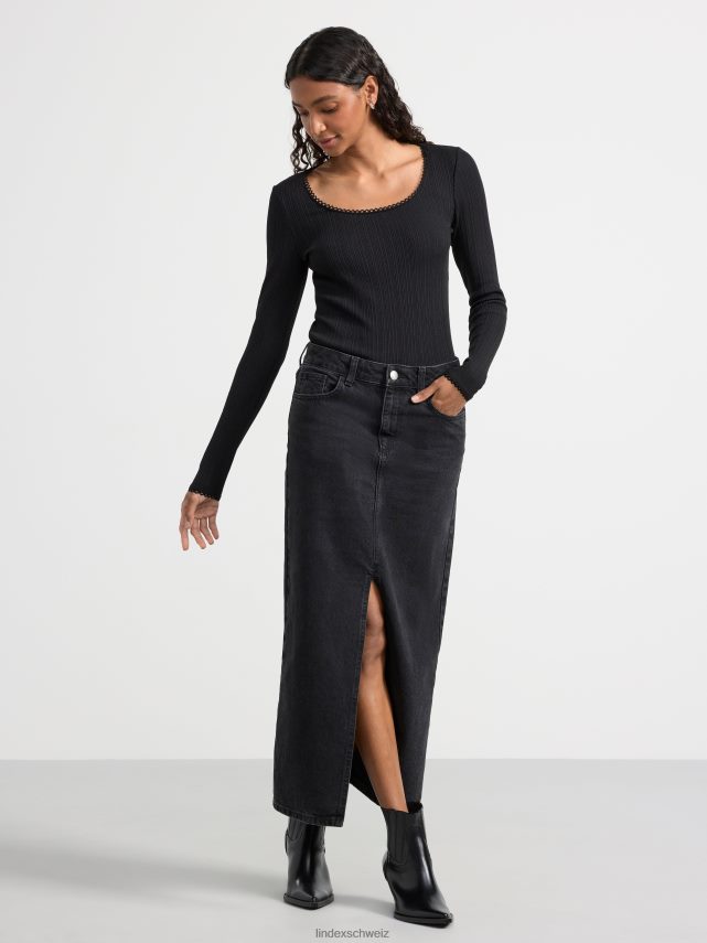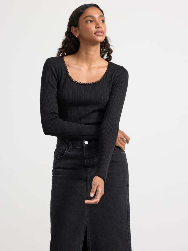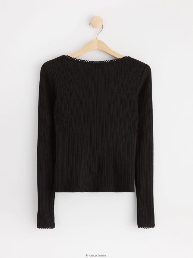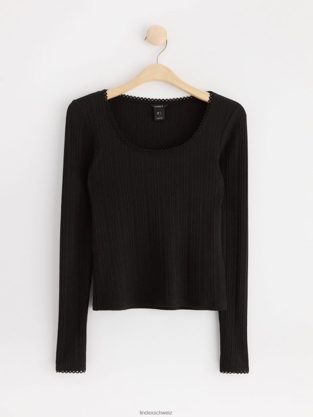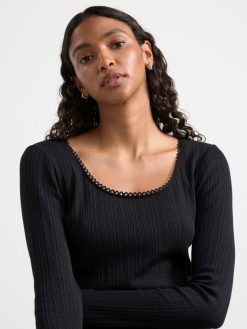 haut côtelé à manches longues confortable et élégant avec une bordure en dentelle à l’encolure.