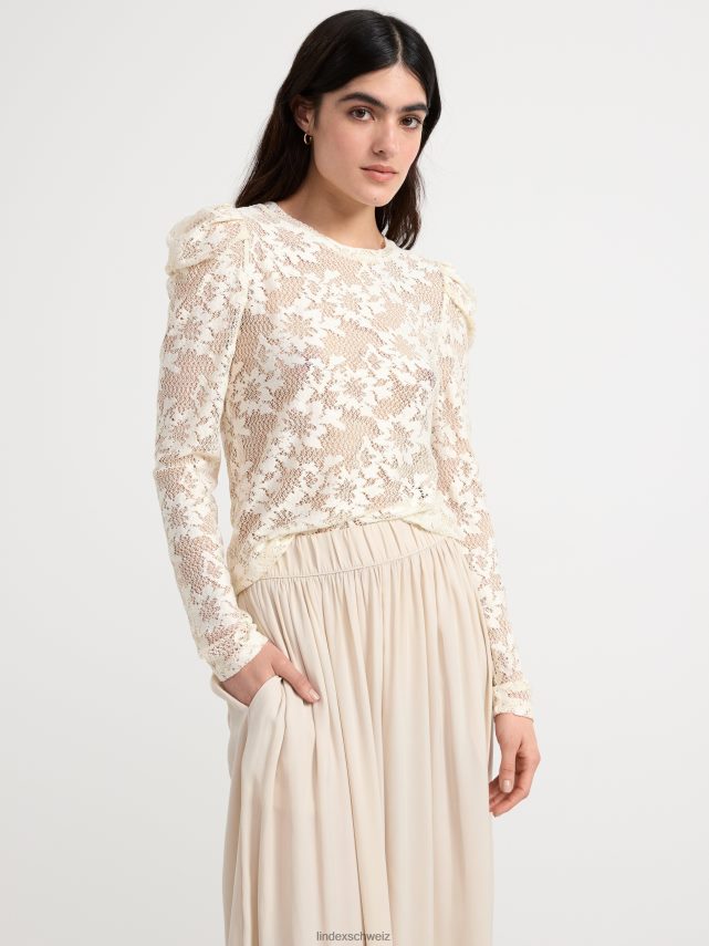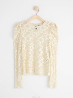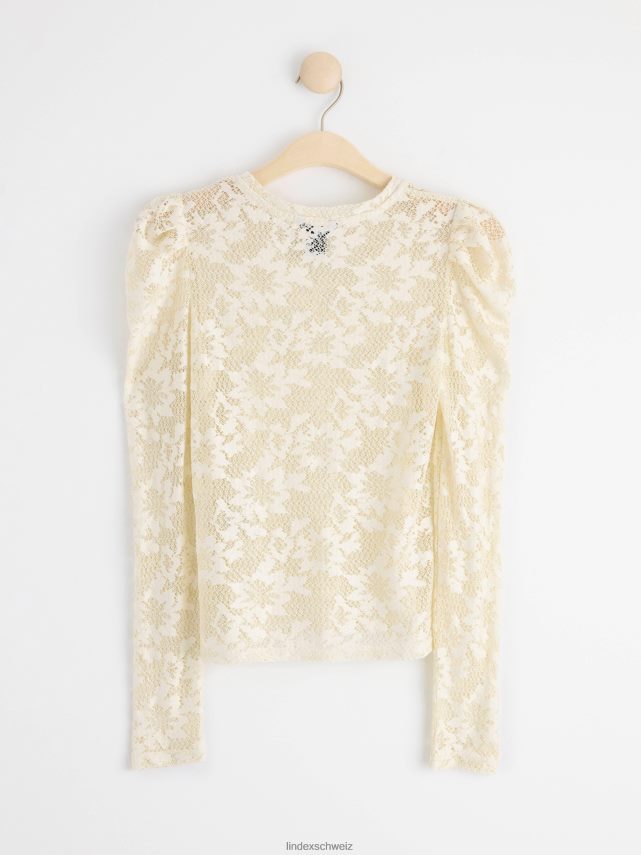 haut ajusté à manches longues bouffantes et encolure ronde, confectionné en dentelle transparente.