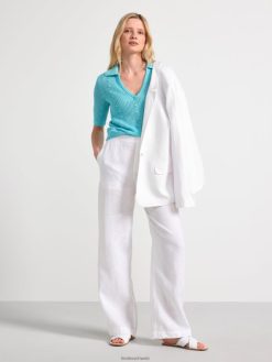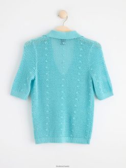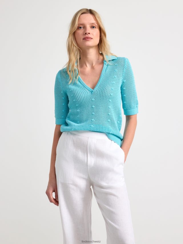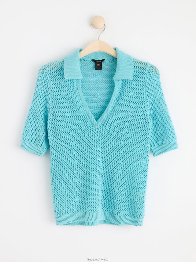 un haut à manches courtes en matière tricotée à trous, avec un col en V et un col. matériel. cette pièce est partiellement fabriquée en coton recyclé. en utilisant du coton recyclé, cela signifie que le coton qui a déjà été cultivé et qui aurait été gaspillé a une autre chance. c’est beaucoup plus économe en ressources et en eau par rapport à la culture de nouveau coton.