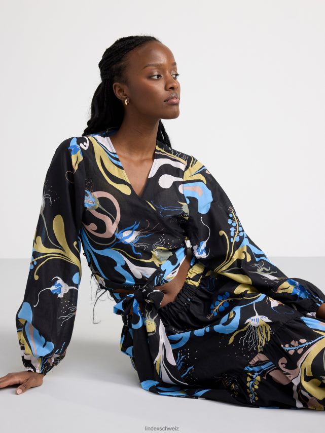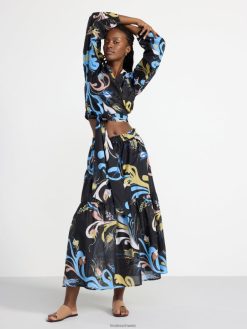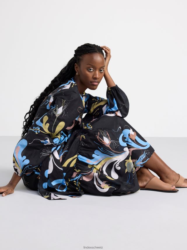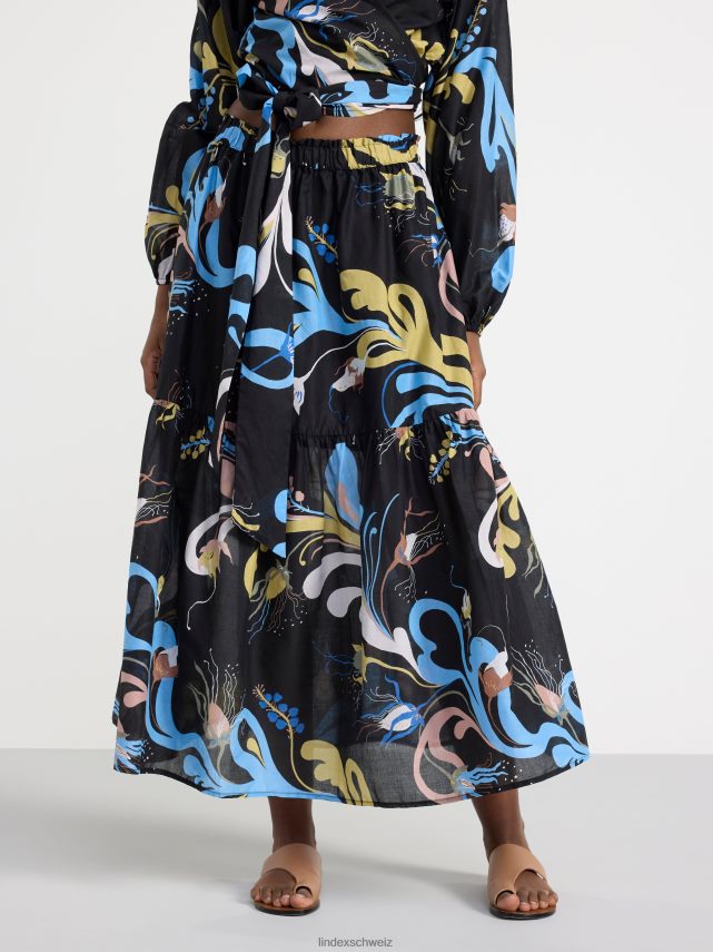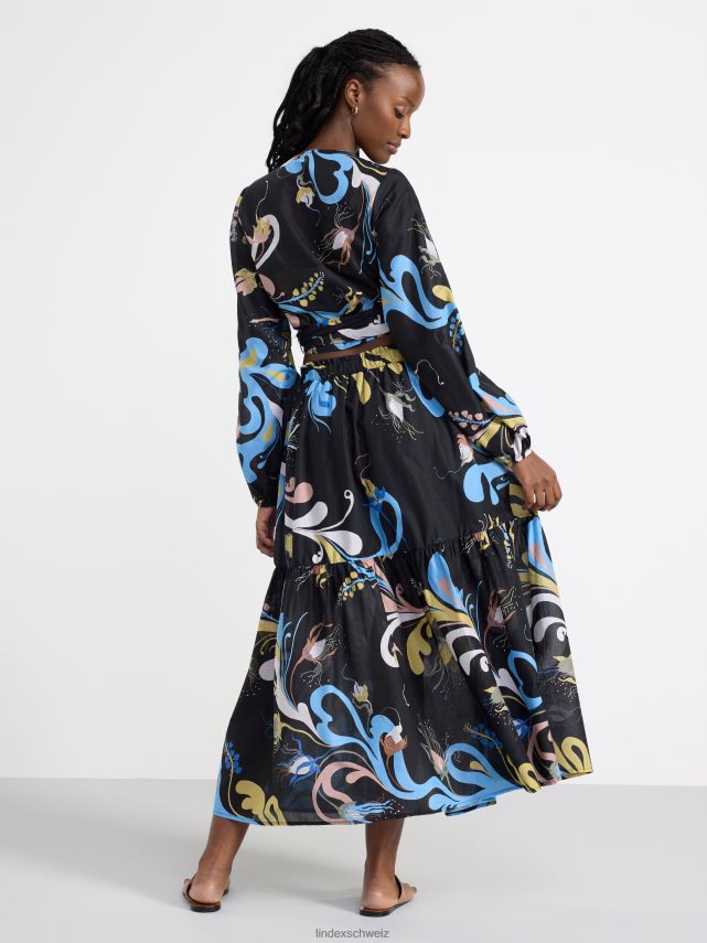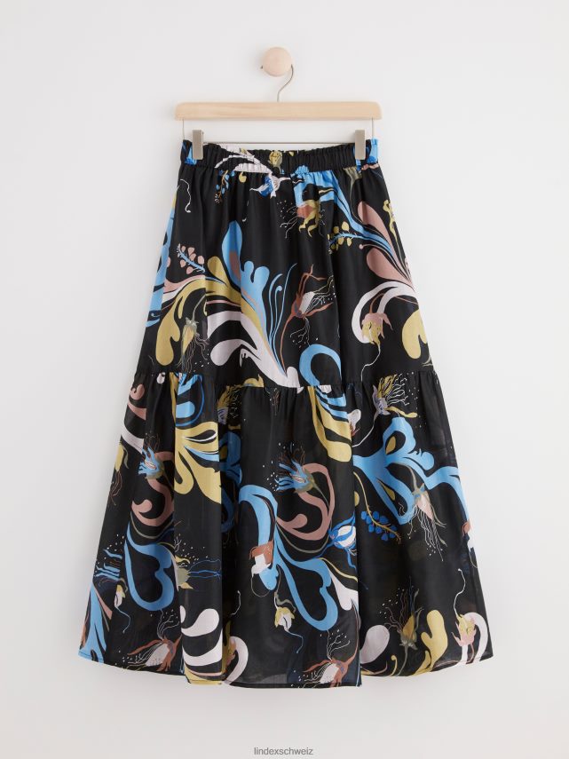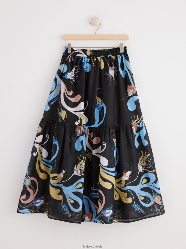 une jupe midi fluide à volants avec un motif intégral, confectionnée en coton tissé doux. le motif est conçu par l’artiste textile suédoise Lisa Sander.