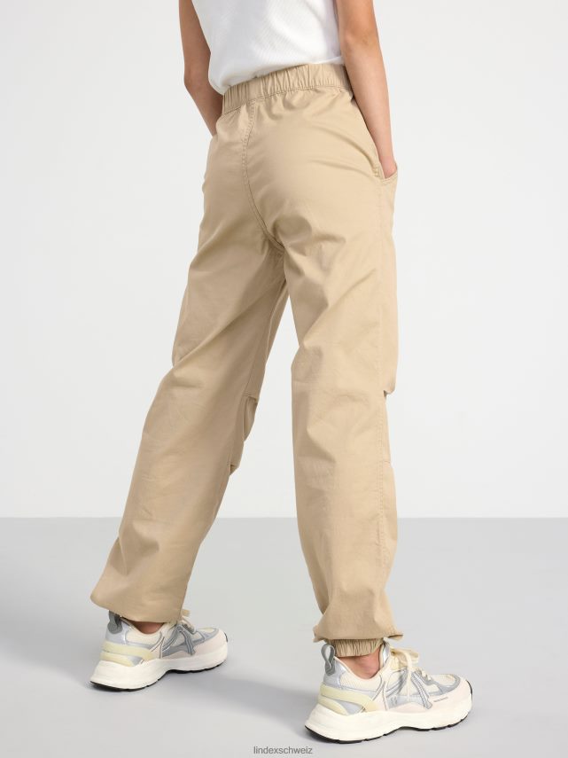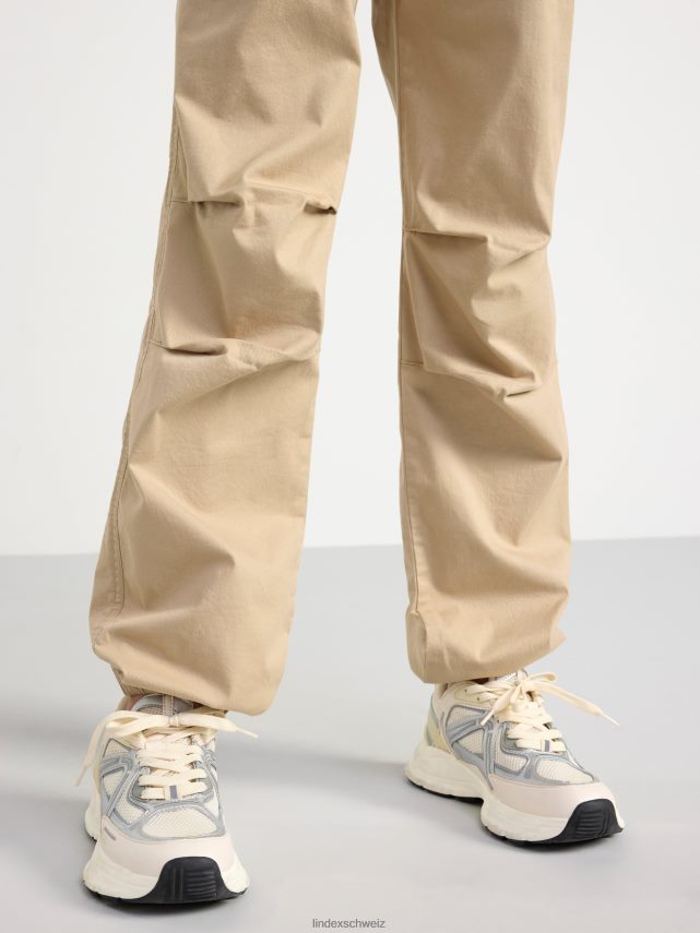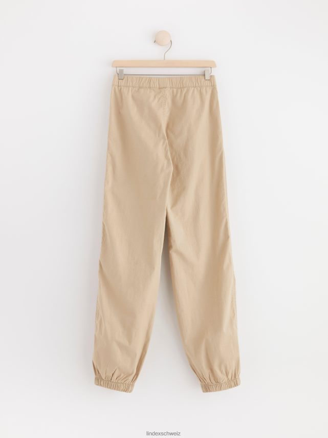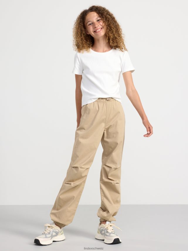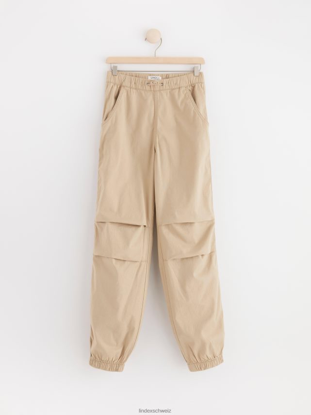 Pantalon parachute en coton léger et robuste avec une taille élastique confortable et des poches latérales. le pantalon est doté de détails pliés aux genoux pour plus de flexibilité et d’ouvertures de jambes élastiques.
