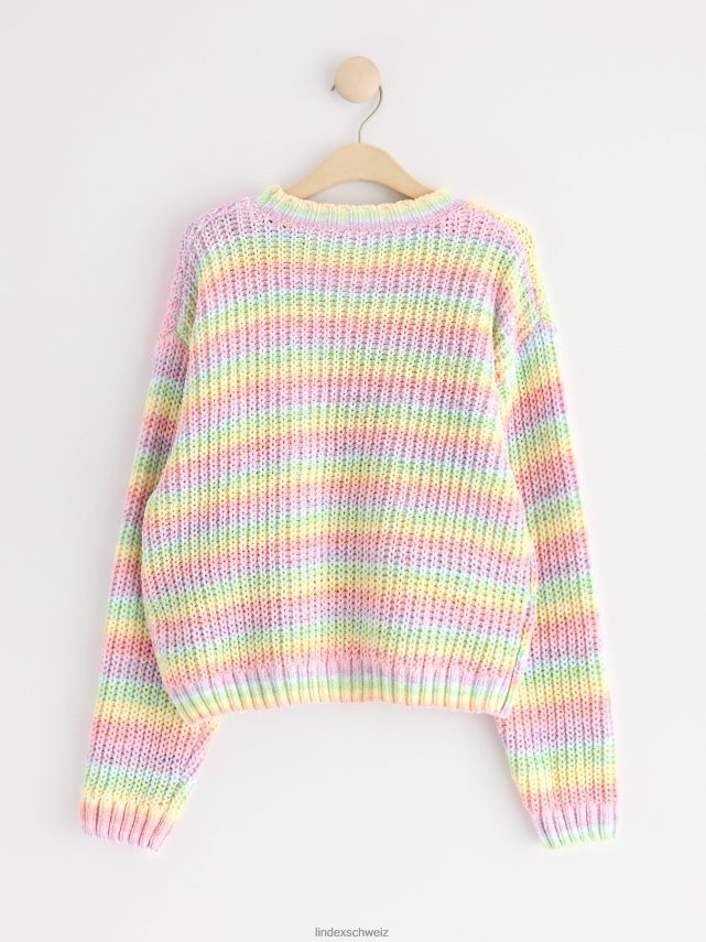un pull confortable dans une matière tricotée super douce aux couleurs de l’arc-en-ciel. matériel. cette pièce est partiellement fabriquée en polyester recyclé. Lorsque l’on utilise du polyester recyclé, cela signifie que des matériaux qui ont déjà été produits, comme les bouteilles en PET, ont une autre chance. il est beaucoup plus économe en ressources que la production de nouveaux matériaux, ce qui le rend meilleur pour l’environnement et réduit l’impact climatique.