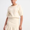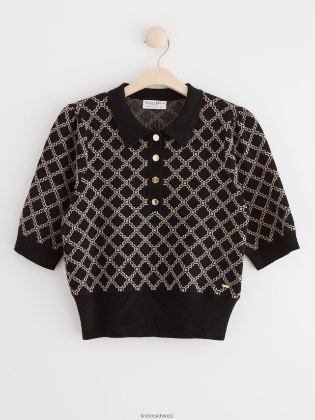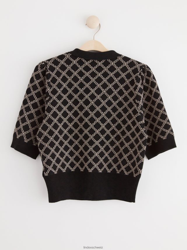 un pull doux à manches courtes en maille jacquard, avec un col et une patte de boutonnage sur le devant. matériel. cette pièce est partiellement confectionnée en lenzing ecovero, une option plus durable par rapport à la viscose conventionnelle. le matériau provient d’une foresterie responsable et est produit avec un impact moindre sur l’environnement.