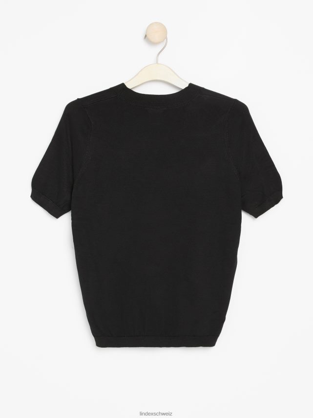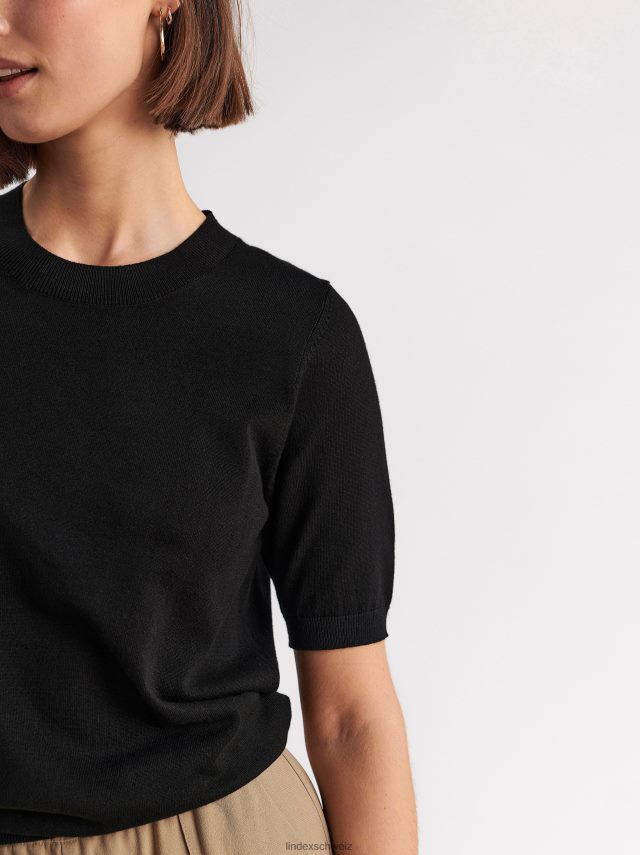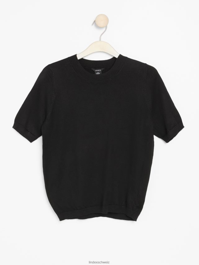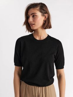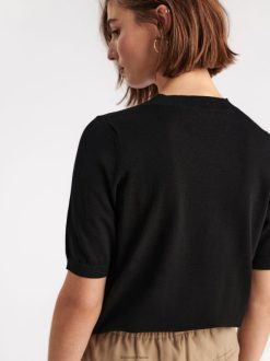 un pull élégant à manches courtes fabriqué dans un mélange de matières en maille fine, fini avec des bordures côtelées. le tissu est fabriqué en viscose écoresponsable par ecovero, une option plus durable par rapport à la viscose conventionnelle.