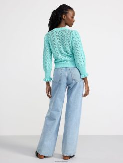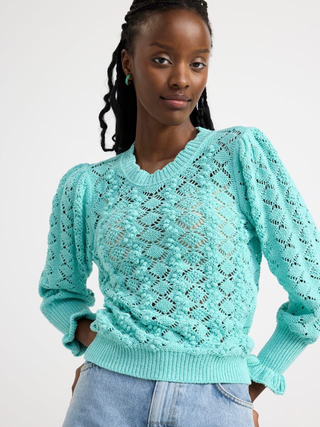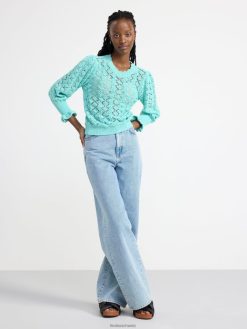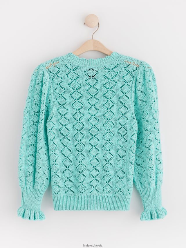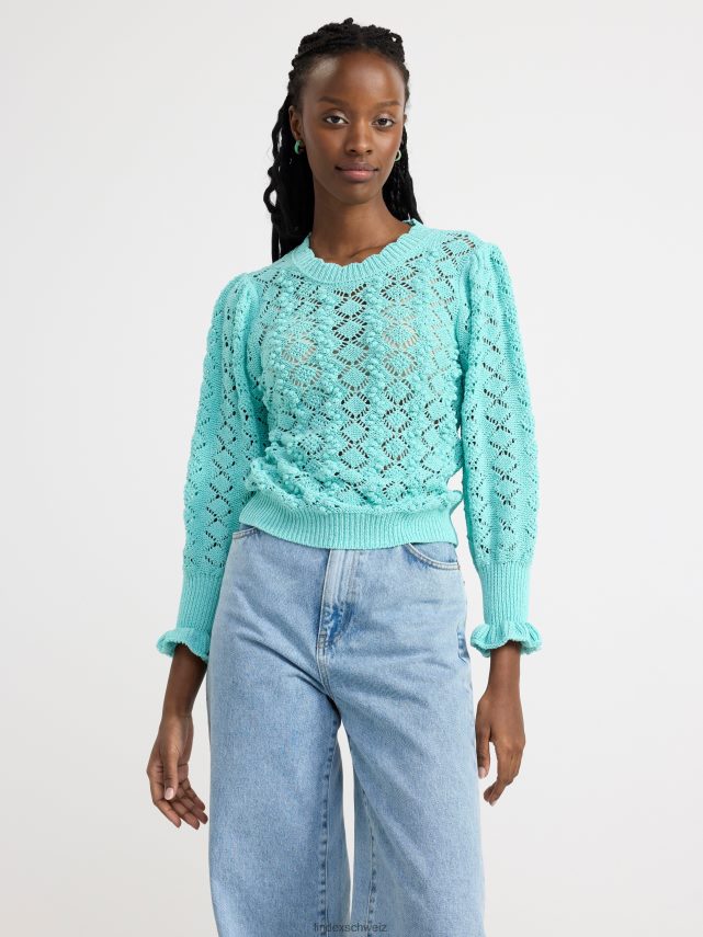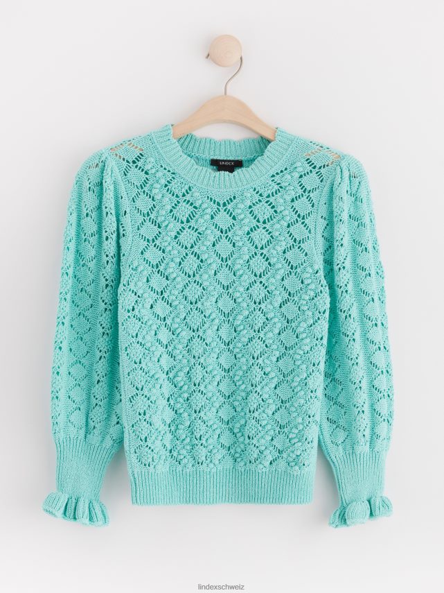 un pull en maille à motif avec une encolure ronde, des manches longues et des bordures volantées aux poignets. matériel. cette pièce est partiellement fabriquée en coton recyclé. en utilisant du coton recyclé, cela signifie que le coton qui a déjà été cultivé et qui aurait été gaspillé a une autre chance. c’est beaucoup plus économe en ressources et en eau par rapport à la culture de nouveau coton.