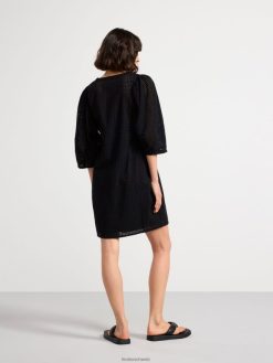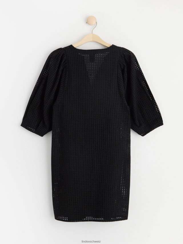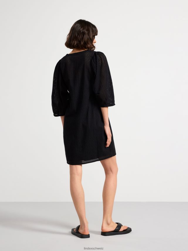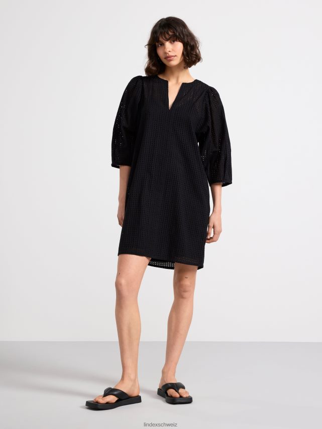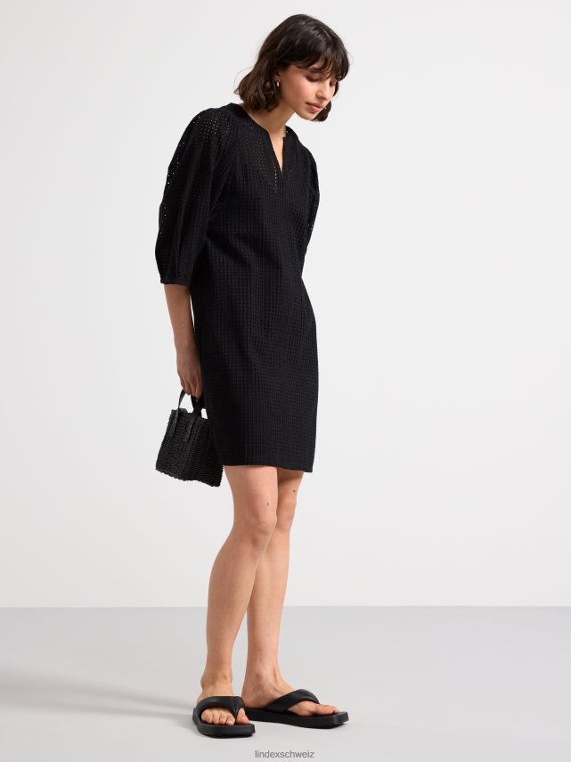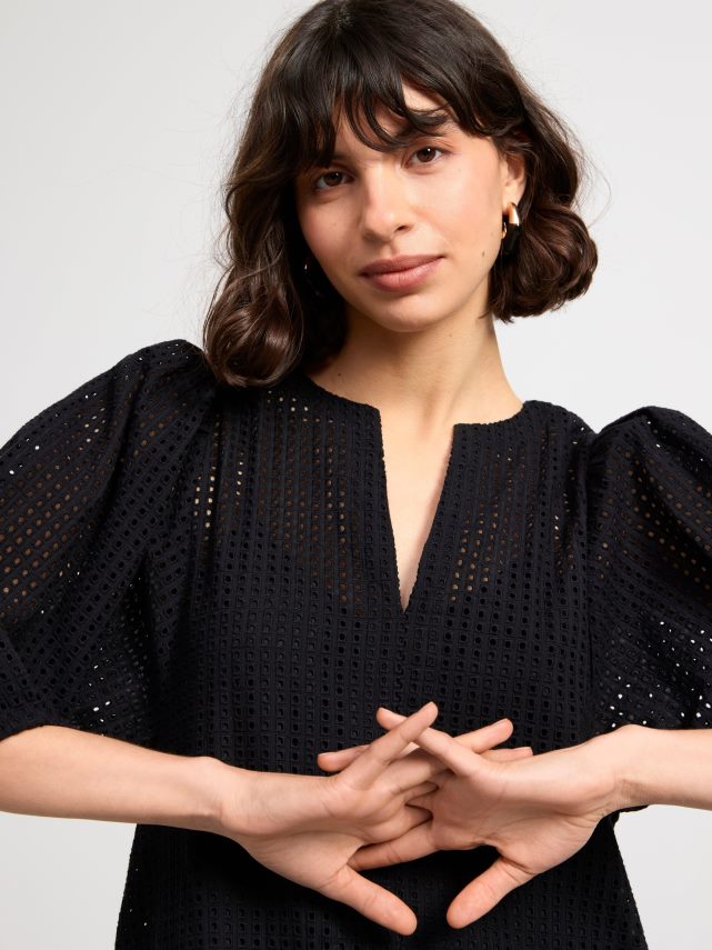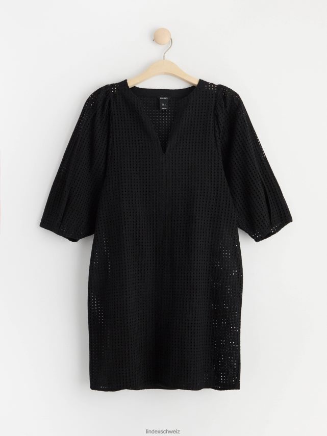 une robe courte élégante en coton tissé impeccable avec une broderie à motif troué. avec de larges manches bouffantes avec des plis aux poignets, un col en V et une robe nuisette avec de fines bretelles en dessous.