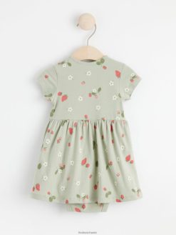 une robe douce à manches courtes avec un body partiel caché sous la jupe. la robe a un imprimé intégral, une patte de boutonnage sur le devant et une jupe évasée. matériel. c’est une pièce certifiée Gots. il est fabriqué à partir de coton biologique et chaque étape de la production a été certifiée de manière indépendante pour garantir qu’elle respecte les exigences sociales et environnementales de Gots (norme mondiale des textiles biologiques).