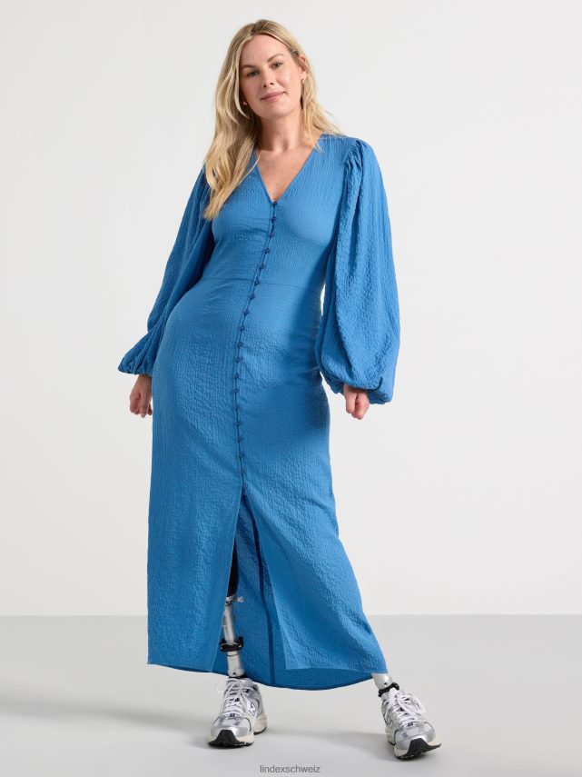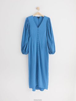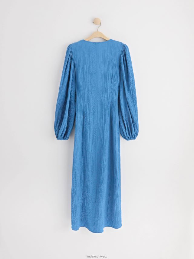 une robe mi-longue en viscose mélangée tissée et texturée avec un col en V, une fermeture boutonnée sur le devant et des manches longues volumineuses.