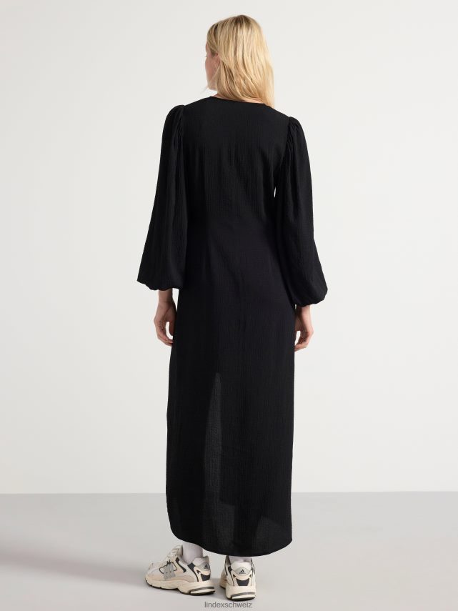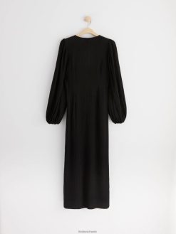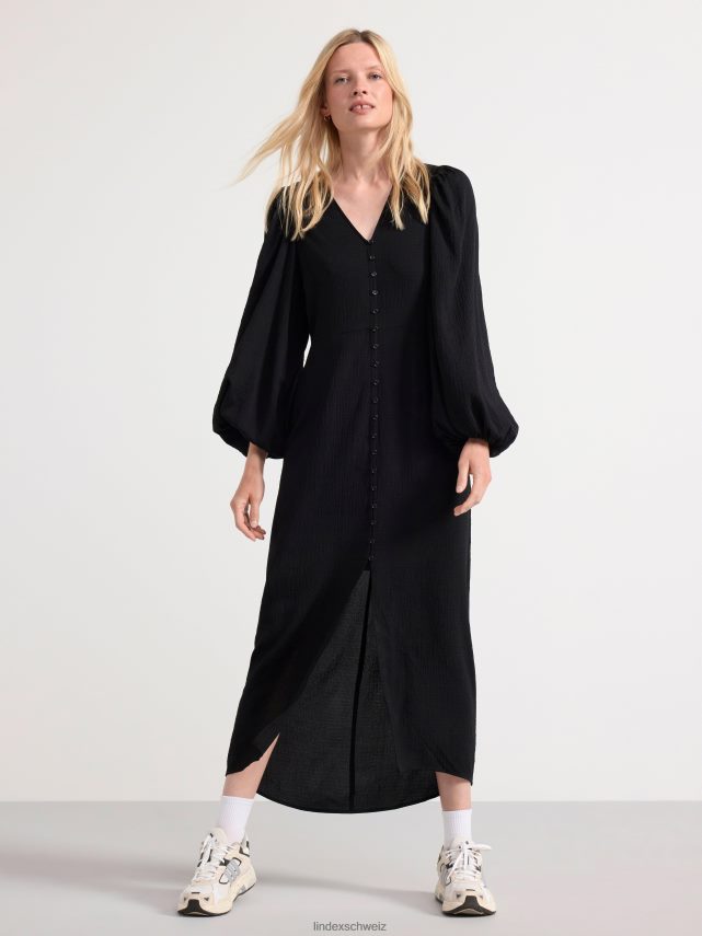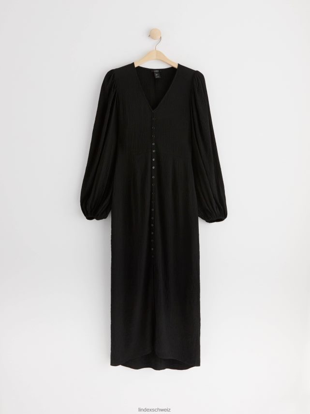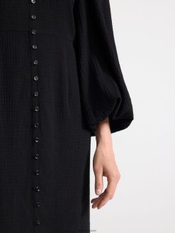 une robe mi-longue en viscose mélangée tissée et texturée avec un col en V, une fermeture boutonnée sur le devant et des manches longues volumineuses.