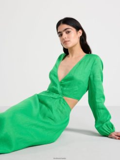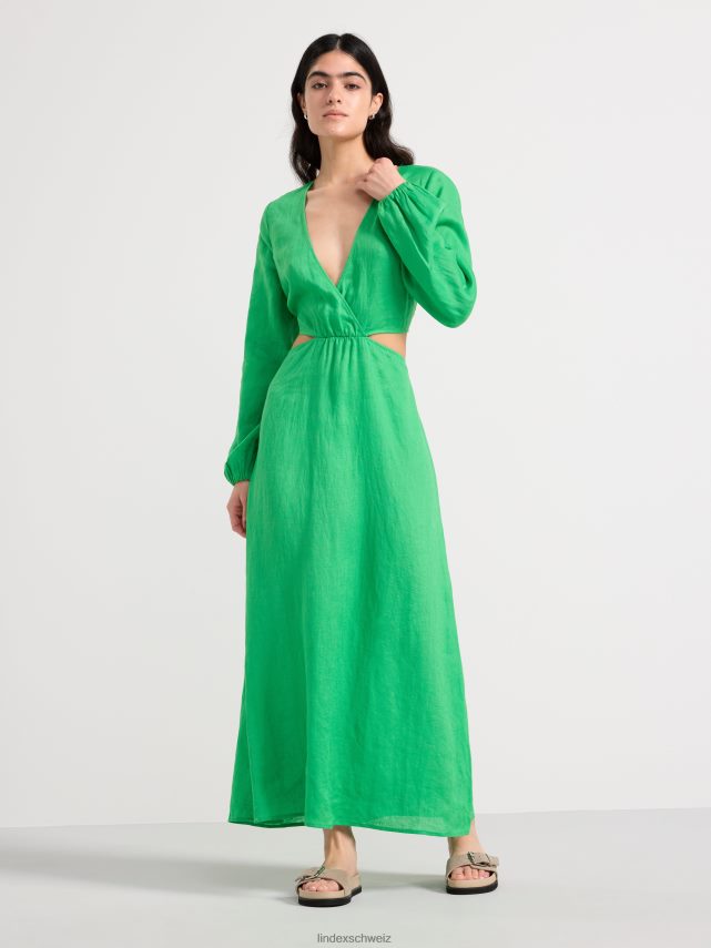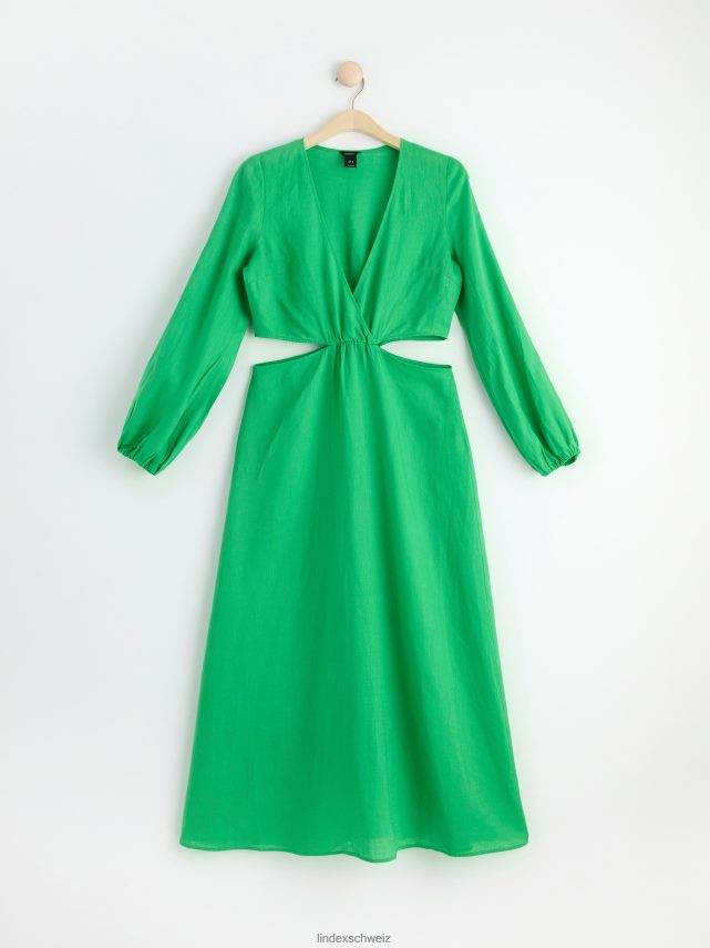 une élégante robe longueur mollet confectionnée en tissu de lin doux avec un devant cache-cœur, des manches longues avec poignets élastiqués et une taille élastiquée avec découpes sur les côtés. qualité supérieure. il s’agit d’une pièce de qualité supérieure en lin. le lin est une matière naturelle aérée, durable et confortable à porter.