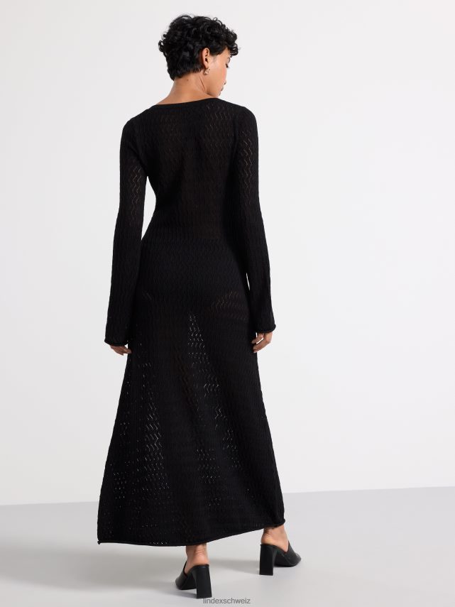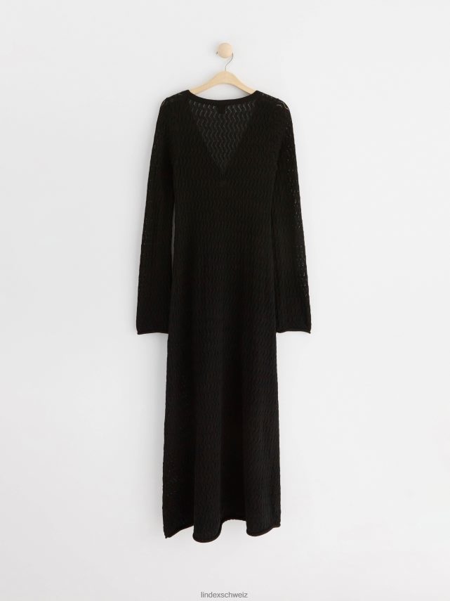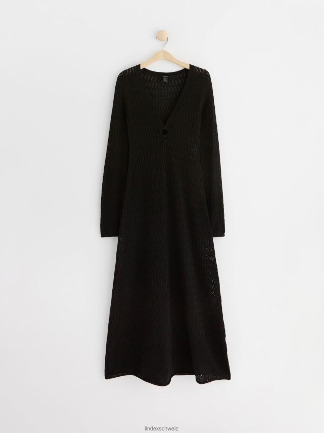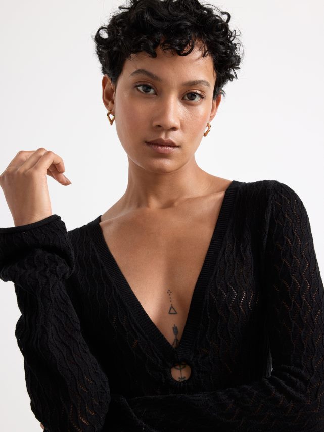 une robe à manches longues élégante et confortable avec un col en V et un motif en tricot troué sur l’ensemble. matériel. cette pièce est partiellement fabriquée en coton recyclé. en utilisant du coton recyclé, cela signifie que le coton qui a déjà été cultivé et qui aurait été gaspillé a une autre chance. c’est beaucoup plus économe en ressources et en eau par rapport à la culture de nouveau coton.