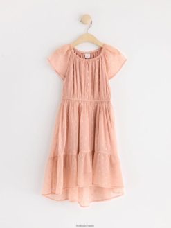 robe légère et fluide en mousseline à manches courtes avec des pois pailletés sur toute la surface et un volant sur la jupe.