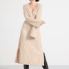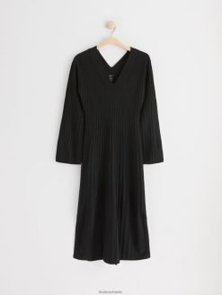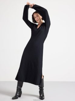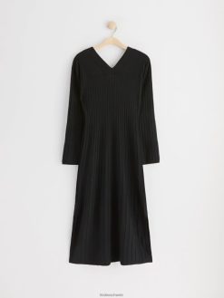 robe longue côtelée en viscose mélangée avec manches longues et larges, col en V et silhouette ajustée. la robe longue a des fentes latérales.