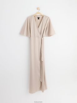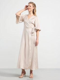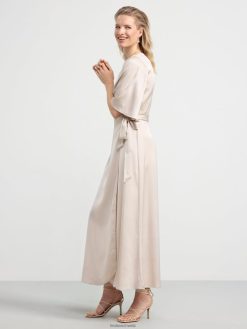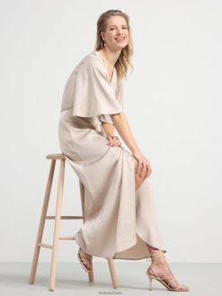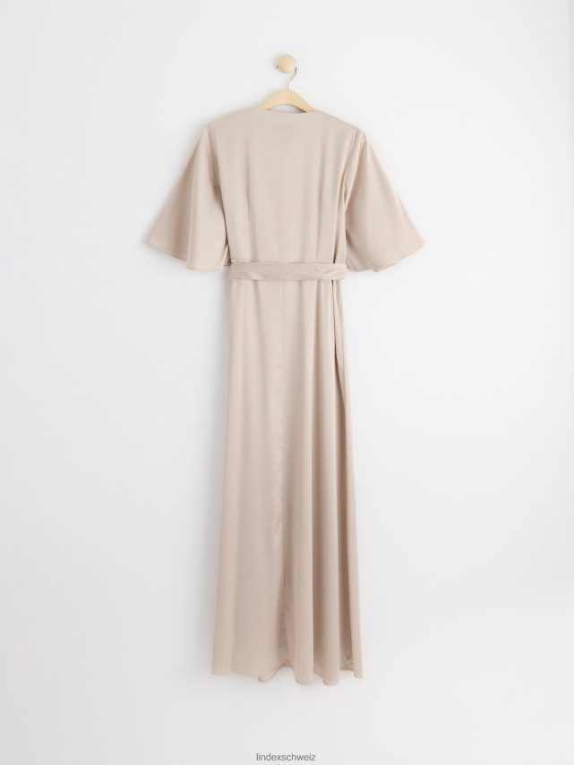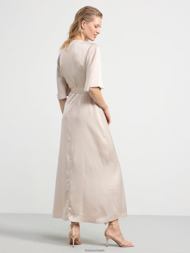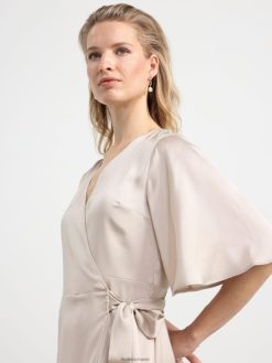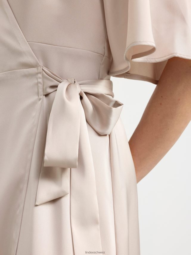 une robe midi élégante en satin fluide avec un col en V et un devant cache-cœur qui se noue sur un côté. matériel. cette pièce est fabriquée à partir de polyester recyclé. Lorsque l’on utilise du polyester recyclé, cela signifie que des matériaux qui ont déjà été produits, comme les bouteilles en PET, ont une autre chance. il est beaucoup plus économe en ressources que la production de nouveaux matériaux, ce qui le rend meilleur pour l’environnement et réduit l’impact climatique.