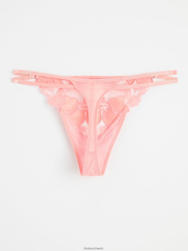 un string taille basse en maille transparente avec des fleurs brodées et des doubles bandes élastiques fines des deux côtés.