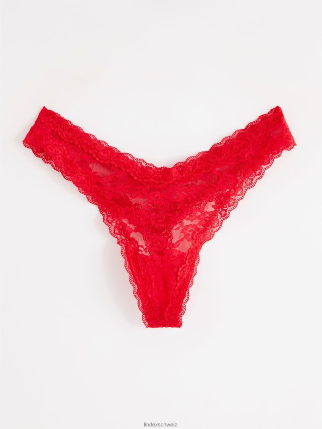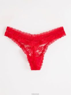 string taille basse et jambe haute, réalisé en dentelle transparente avec bords festonnés.