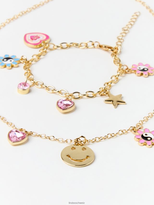 un joli ensemble en métal doré, comprenant un collier et un bracelet avec différents motifs de charms.