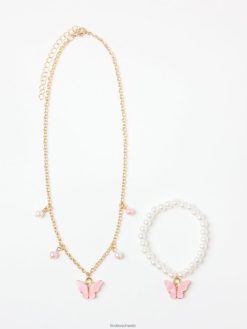 un joli ensemble comprenant un collier avec une chaîne dorée et un bracelet élastique en perles. tous deux avec des breloques papillon roses.