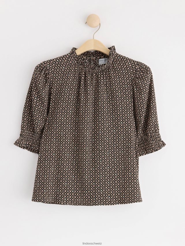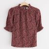 un chemisier élégant dans une matière légère et froissée, avec des manches courtes bouffantes et un col à volants.