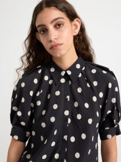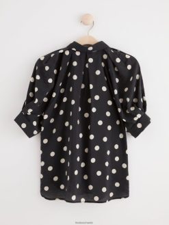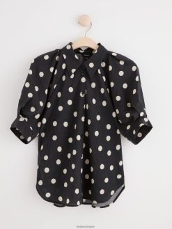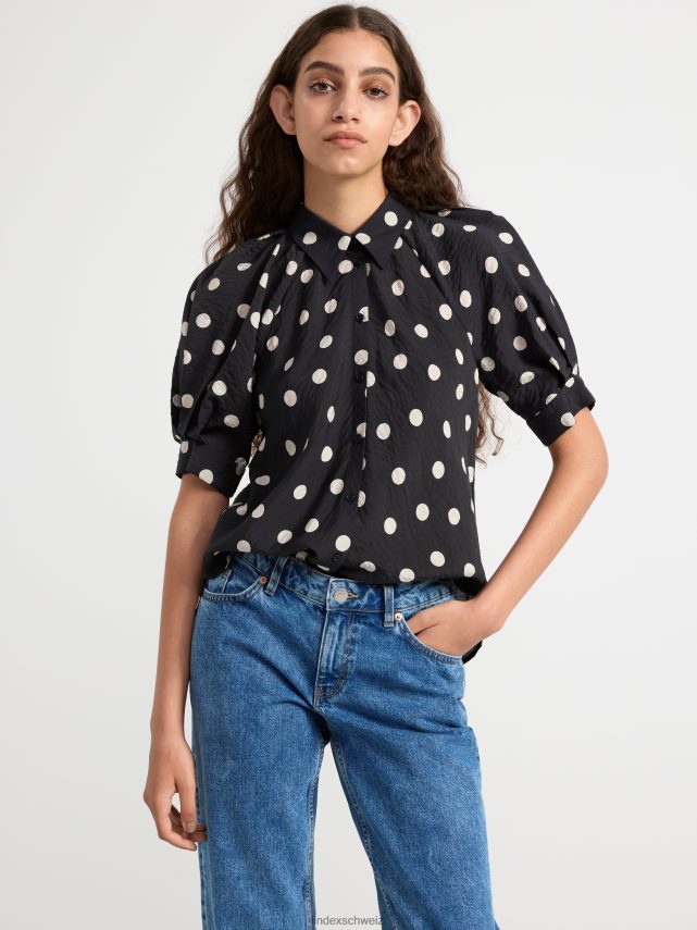 un chemisier élégant avec des manches courtes bouffantes, un col chemise et des boutons sur le devant. fabriqué en mélange de viscose doux. matériel. cette pièce est en partie basée sur une nouvelle fois by sodra, une nouvelle matière première innovante en fibre de viscose, où des textiles recyclés sont combinés avec du bois issu de forêts gérées de manière responsable. oncemore est un matériau de haute qualité et est produit avec un impact moindre sur l’environnement par rapport aux matières premières en fibre de viscose conventionnelles.