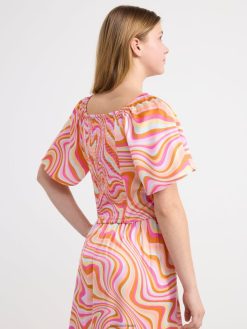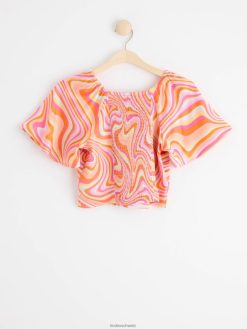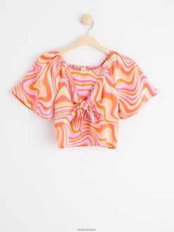un chemisier à manches courtes avec une silhouette courte en satin doux avec un motif coloré. avec manches courtes, dos smocké et lien à nouer sur le devant. matériel. cette pièce est fabriquée à partir de polyester recyclé. Lorsque l’on utilise du polyester recyclé, cela signifie que des matériaux qui ont déjà été produits, comme les bouteilles en PET, ont une autre chance. il est beaucoup plus économe en ressources que la production de nouveaux matériaux, ce qui le rend meilleur pour l’environnement et réduit l’impact climatique.